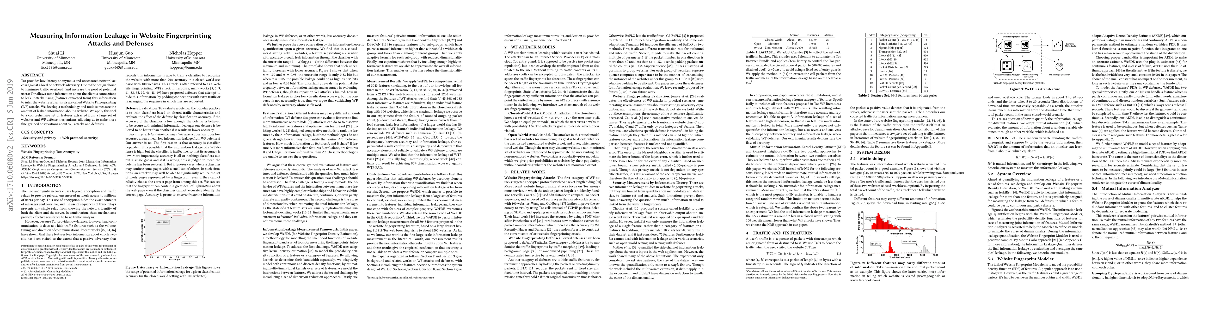 Tor provides low-latency anonymous and uncensored network access against a local or network adversary. Due to the design choice to minimize traffic overhead (and increase the pool of potential users) Tor allows some information about the client's connections to leak. Attacks using (features extracted from) this information to infer the website a user visits are called Website Fingerprinting (WF) attacks. We develop a methodology and tools to measure the amount of leaked information about a website. We apply this tool to a comprehensive set of features extracted from a large set of websites and WF defense mechanisms, allowing us to make more fine-grained observations about WF attacks and defenses.