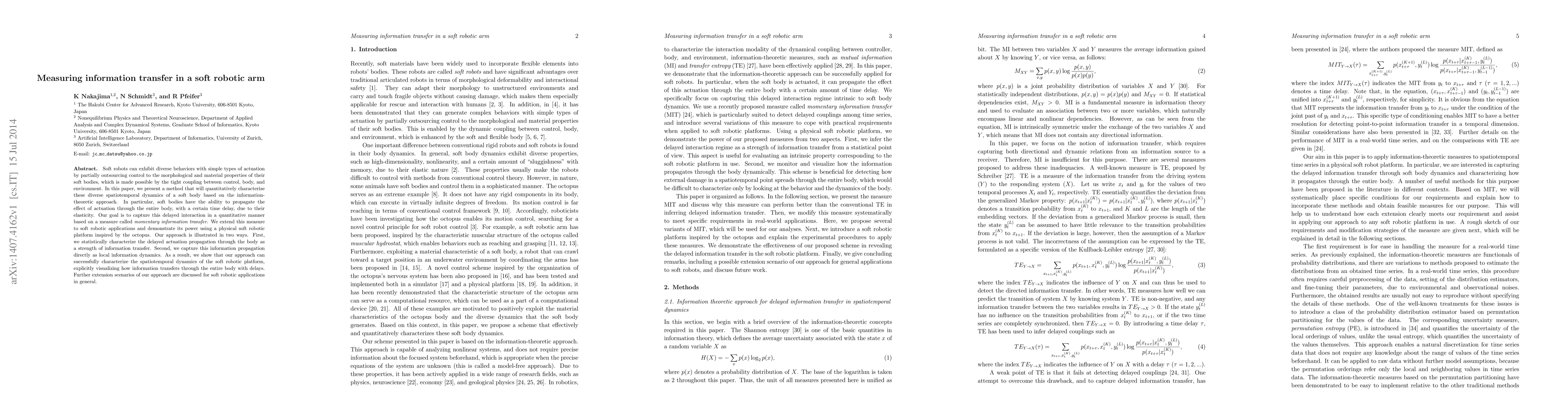 This paper proposes an information-theoretic method to quantify the spatiotemporal dynamics of a soft robotic arm, focusing on the delayed propagation of actuation effects due to the arm's elasticity. The method measures momentary information transfer to characterize how information flows through the soft body, providing insights into its dynamic behavior.