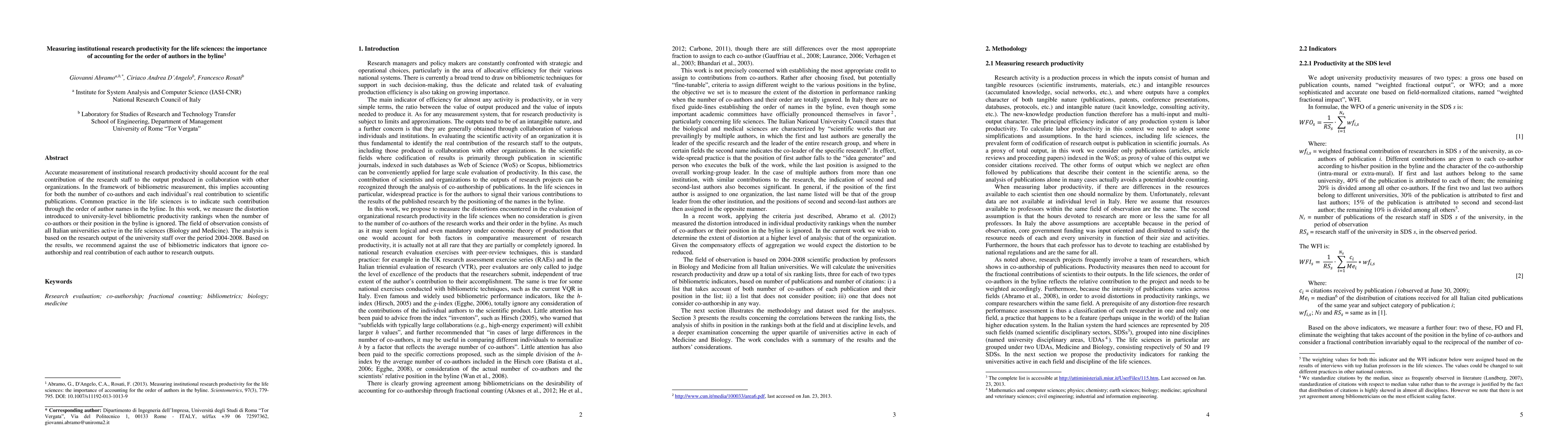 This paper examines the impact of ignoring author order in bibliometric productivity rankings for Italian universities in life sciences, finding significant distortions when co-authorship and individual contributions are not considered. It recommends using bibliometric indicators that account for both co-authorship and the real contribution of each author.