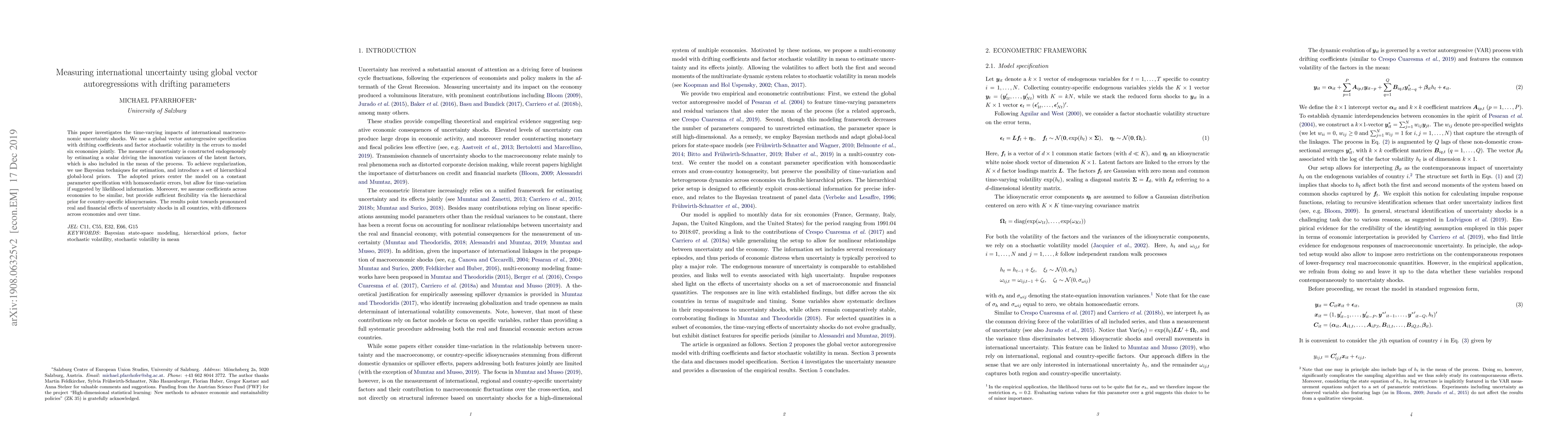 This paper employs a global vector autoregression model with drifting parameters to measure time-varying impacts of international macroeconomic uncertainty shocks across six economies. Bayesian techniques and hierarchical global-local priors are used for regularization, revealing significant real and financial effects of uncertainty shocks that vary across countries and time.