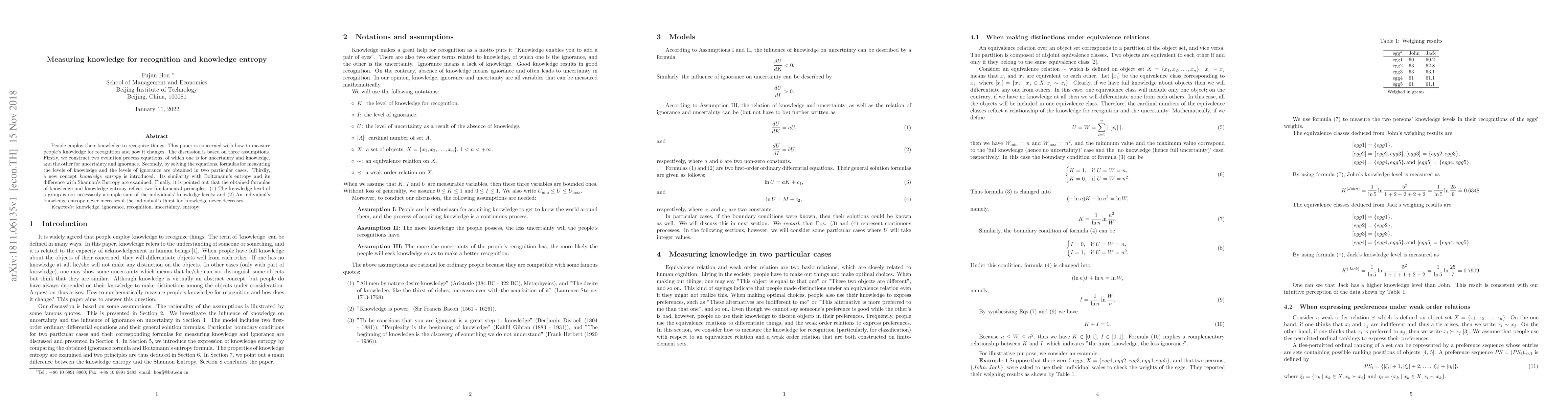 People employ their knowledge to recognize things. This paper is concerned with how to measure people's knowledge for recognition and how it changes. The discussion is based on three assumptions. Firstly, we construct two evolution process equations, of which one is for uncertainty and knowledge, and the other for uncertainty and ignorance. Secondly, by solving the equations, formulas for measuring the levels of knowledge and the levels of ignorance are obtained in two particular cases. Thirdly, a new concept of knowledge entropy is introduced. Its similarity with Boltzmann's entropy and its difference with Shannon's Entropy are examined. Finally, it is pointed out that the obtained formulas of knowledge and knowledge entropy reflect two fundamental principles: (1) The knowledge level of a group is not necessarily a simple sum of the individuals' knowledge levels; and (2) An individual's knowledge entropy never increases if the individual's thirst for knowledge never decreases.