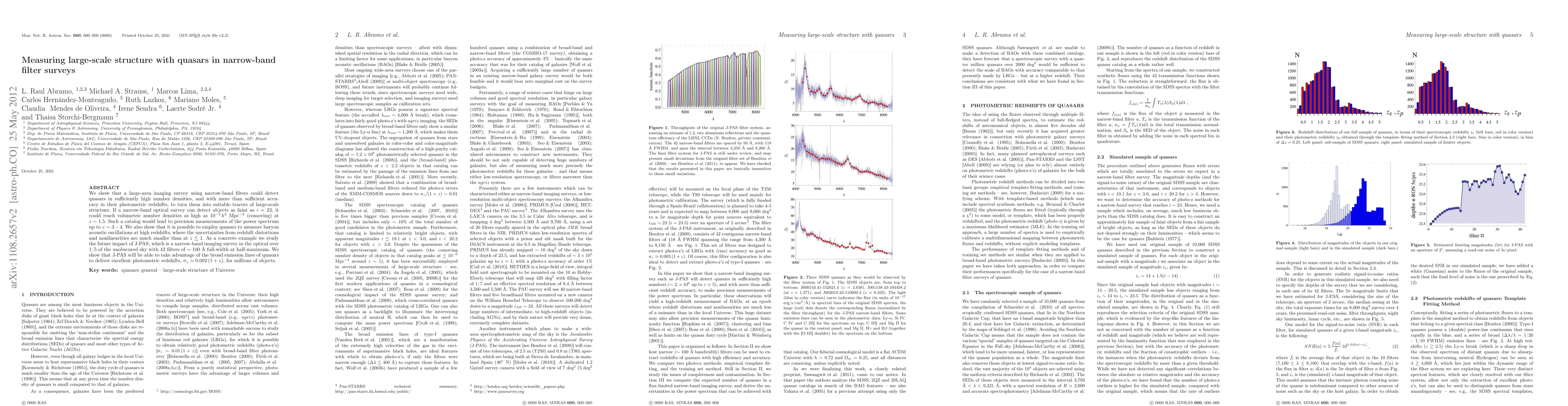 We show that a large-area imaging survey using narrow-band filters could detect quasars in sufficiently high number densities, and with more than sufficient accuracy in their photometric redshifts, to turn them into suitable tracers of large-scale structure. If a narrow-band optical survey can detect objects as faint as i=23, it could reach volumetric number densities as high as 10^{-4} h^3 Mpc^{-3} (comoving) at z~1.5 . Such a catalog would lead to precision measurements of the power spectrum up to z~3-4. We also show that it is possible to employ quasars to measure baryon acoustic oscillations at high redshifts, where the uncertainties from redshift distortions and nonlinearities are much smaller than at z<1. As a concrete example we study the future impact of J-PAS, which is a narrow-band imaging survey in the optical over 1/5 of the unobscured sky with 42 filters of ~100 A full-width at half-maximum. We show that J-PAS will be able to take advantage of the broad emission lines of quasars to deliver excellent photometric redshifts, \sigma_{z}~0.002(1+z), for millions of objects.
