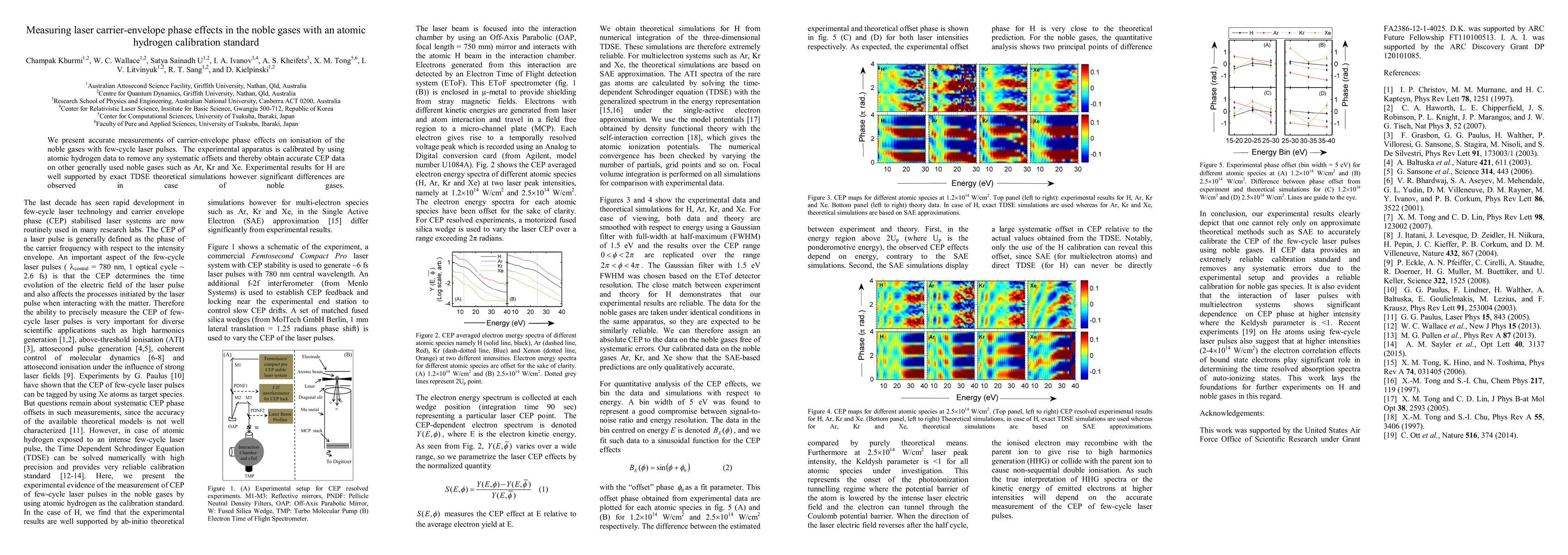 This paper measures carrier-envelope phase effects on noble gas ionization using few-cycle laser pulses, calibrated by atomic hydrogen data to eliminate systematic errors. While hydrogen results align with theoretical simulations, notable discrepancies arise in the noble gas data.