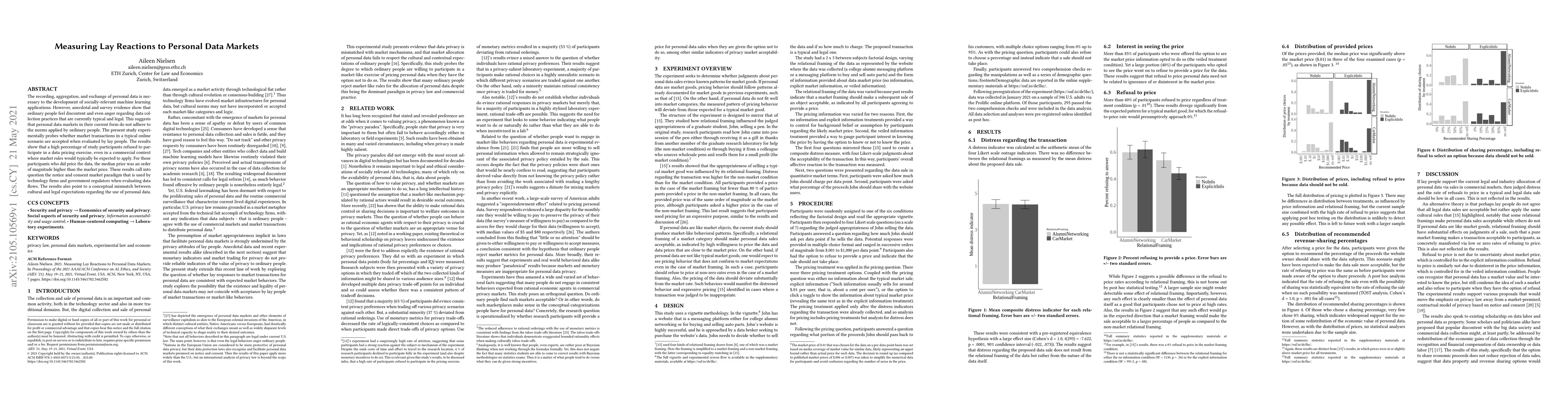 The recording, aggregation, and exchange of personal data is necessary to the development of socially-relevant machine learning applications. However, anecdotal and survey evidence show that ordinary people feel discontent and even anger regarding data collection practices that are currently typical and legal. This suggests that personal data markets in their current form do not adhere to the norms applied by ordinary people. The present study experimentally probes whether market transactions in a typical online scenario are accepted when evaluated by lay people. The results show that a high percentage of study participants refused to participate in a data pricing exercise, even in a commercial context where market rules would typically be expected to apply. For those participants who did price the data, the median price was an order of magnitude higher than the market price. These results call into question the notice and consent market paradigm that is used by technology firms and government regulators when evaluating data flows. The results also point to a conceptual mismatch between cultural and legal expectations regarding the use of personal data.