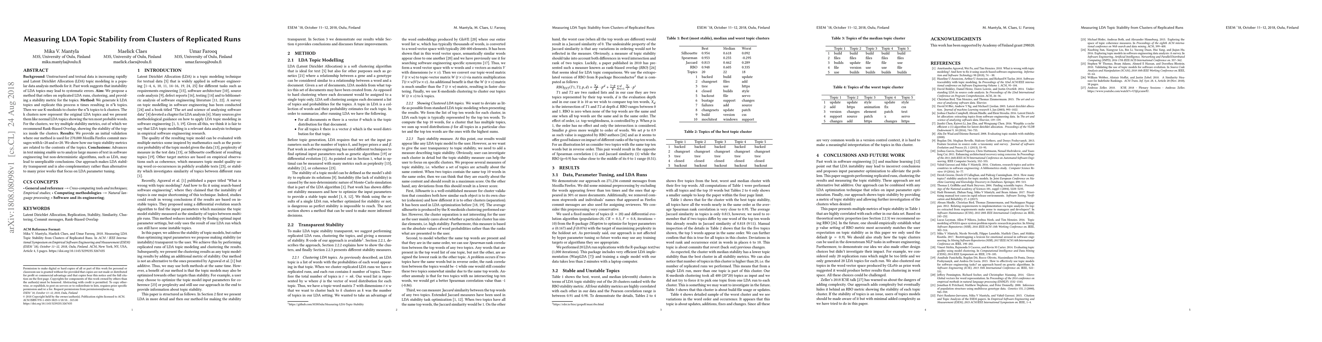 Background: Unstructured and textual data is increasing rapidly and Latent Dirichlet Allocation (LDA) topic modeling is a popular data analysis methods for it. Past work suggests that instability of LDA topics may lead to systematic errors. Aim: We propose a method that relies on replicated LDA runs, clustering, and providing a stability metric for the topics. Method: We generate k LDA topics and replicate this process n times resulting in n*k topics. Then we use K-medioids to cluster the n*k topics to k clusters. The k clusters now represent the original LDA topics and we present them like normal LDA topics showing the ten most probable words. For the clusters, we try multiple stability metrics, out of which we recommend Rank-Biased Overlap, showing the stability of the topics inside the clusters. Results: We provide an initial validation where our method is used for 270,000 Mozilla Firefox commit messages with k=20 and n=20. We show how our topic stability metrics are related to the contents of the topics. Conclusions: Advances in text mining enable us to analyze large masses of text in software engineering but non-deterministic algorithms, such as LDA, may lead to unreplicable conclusions. Our approach makes LDA stability transparent and is also complementary rather than alternative to many prior works that focus on LDA parameter tuning.