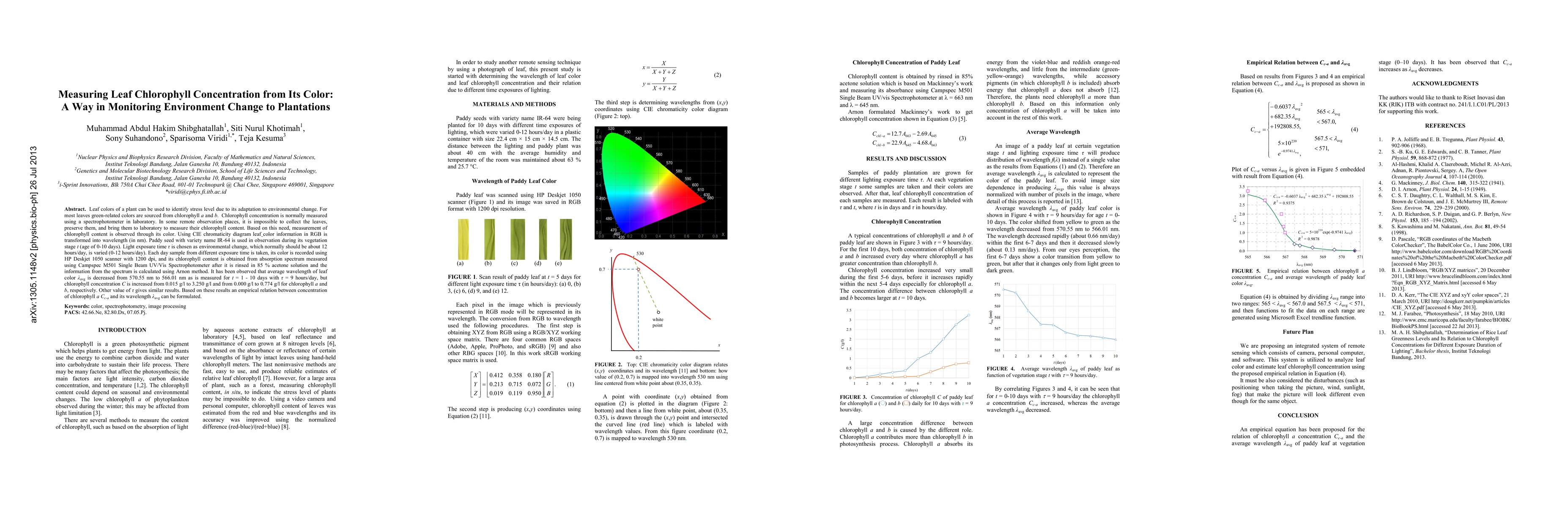 Researchers found that leaf color can be used to measure chlorophyll concentration in plants under changing environmental conditions without laboratory testing. By analyzing the relationship between chlorophyll concentration and wavelength of plant color, an empirical formula was developed.