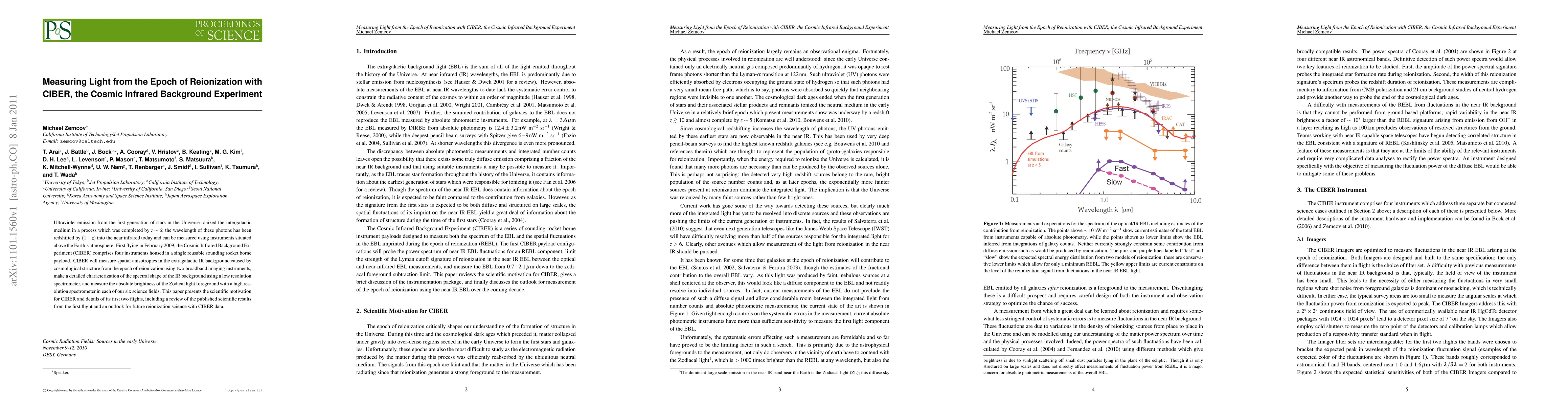 This paper discusses the Cosmic Infrared Background Experiment (CIBER) designed to measure the light from the epoch of reionization, redshifted into the near infrared. The first two flights of CIBER have provided data on spatial anisotropies in the extragalactic IR background and the spectral shape of the IR background, contributing to our understanding of the early Universe.