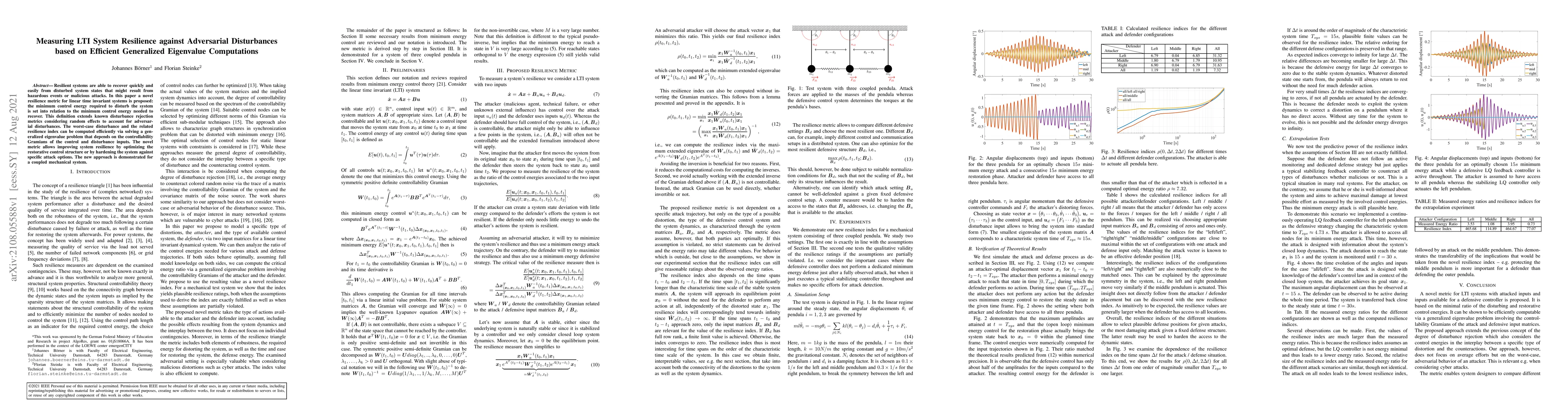 This paper proposes a novel resilience metric for linear time invariant systems, relating the control energy required to recover from adversarial disturbances to the energy needed to initially disturb the system. The resilience index is computed efficiently through a generalized eigenvalue problem, enabling optimization of restorative control structures or system hardening against specific attacks. The method is demonstrated in a coupled mechanical system.
