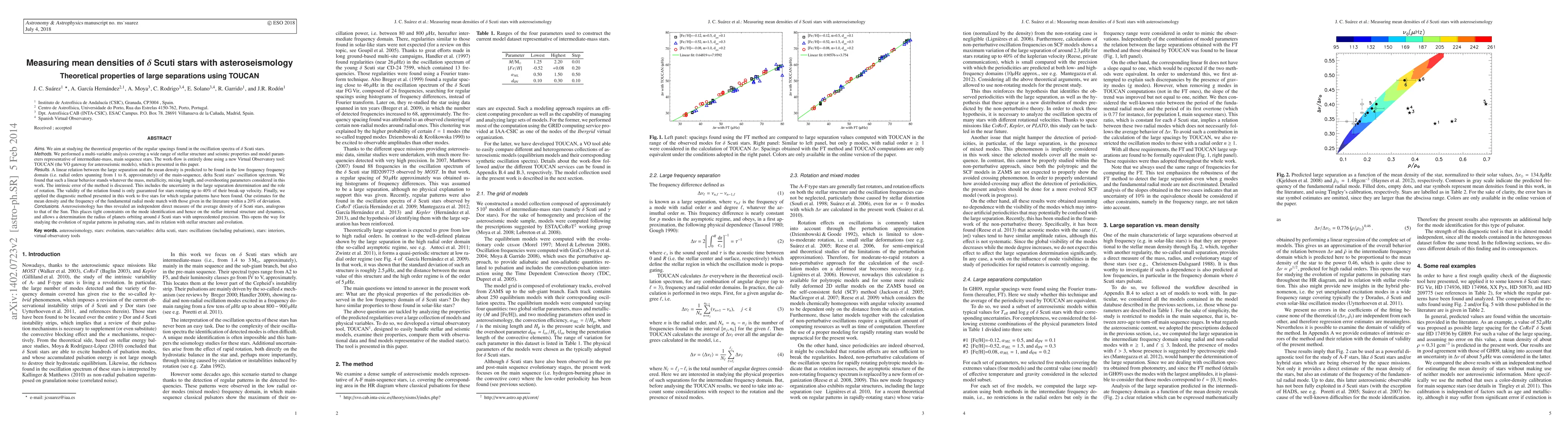 We aim at studying the theoretical properties of the regular spacings found in the oscillation spectra of delta Scuti stars. We performed a multi-variable analysis covering a wide range of stellar structure and seismic properties and model parameters representative of intermediate-mass, main sequence stars. The work-flow is entirely done using a new Virtual Observatory tool: TOUCAN (the VO gateway for asteroseismic models), which is presented in this paper. A linear relation between the large separation and the mean density is predicted to be found in the low frequency frequency domain (i.e. radial orders spanning from 1 to 8, approximately) of the main-sequence, delta Scuti stars' oscillation spectrum. We found that such a linear behavior stands whatever the mass, metallicity, mixing length, and overshooting parameters considered in this work. The intrinsic error of the method is discussed. This includes the uncertainty in the large separation determination and the role of rotation. The validity of the relation found is only guaranteed for stars rotating up to 40 percent of their break-up velocity. Finally, we applied the diagnostic method presented in this work to five stars for which regular patterns have been found. Our estimates for the mean density and the frequency of the fundamental radial mode match with those given in the literature within a 20 percent of deviation. Asteroseismology has thus revealed an independent direct measure of the average density of delta Scuti stars, analogous to that of the Sun. This places tight constraints on the mode identification and hence on the stellar internal structure and dynamics, and allows a determination the radius of planets orbiting around delta Scuti stars with unprecedented precision. This opens the way for studying the evolution of regular patterns in pulsating stars, and its relation with stellar structure and evolution.