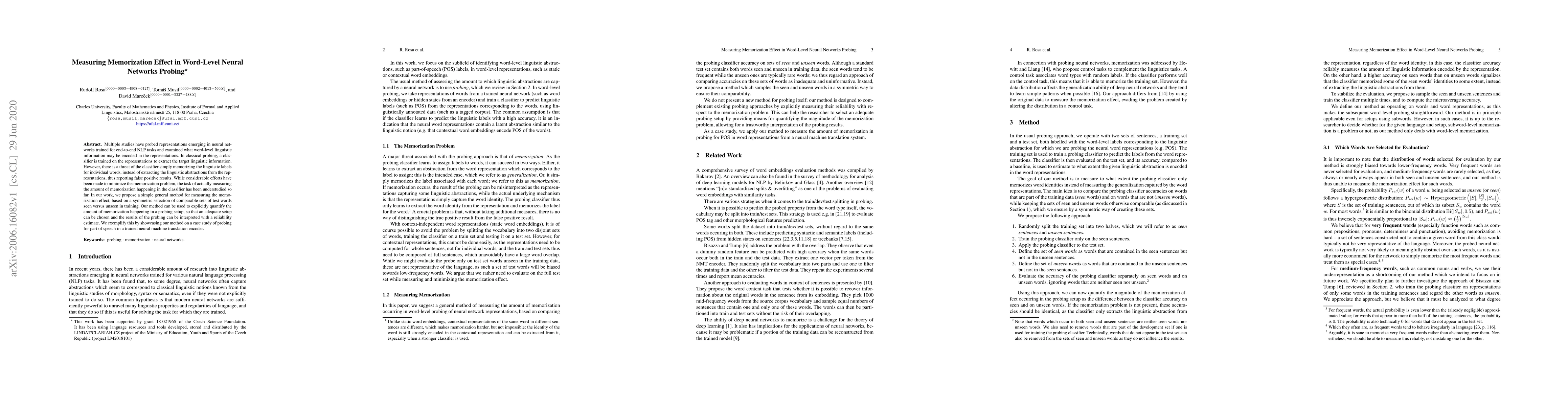 This paper proposes a method for measuring the memorization effect in word-level neural network probing, aiming to quantify how much a classifier relies on memorization rather than linguistic abstraction. The method uses symmetric selection of seen versus unseen words to provide a reliability estimate for probing results.