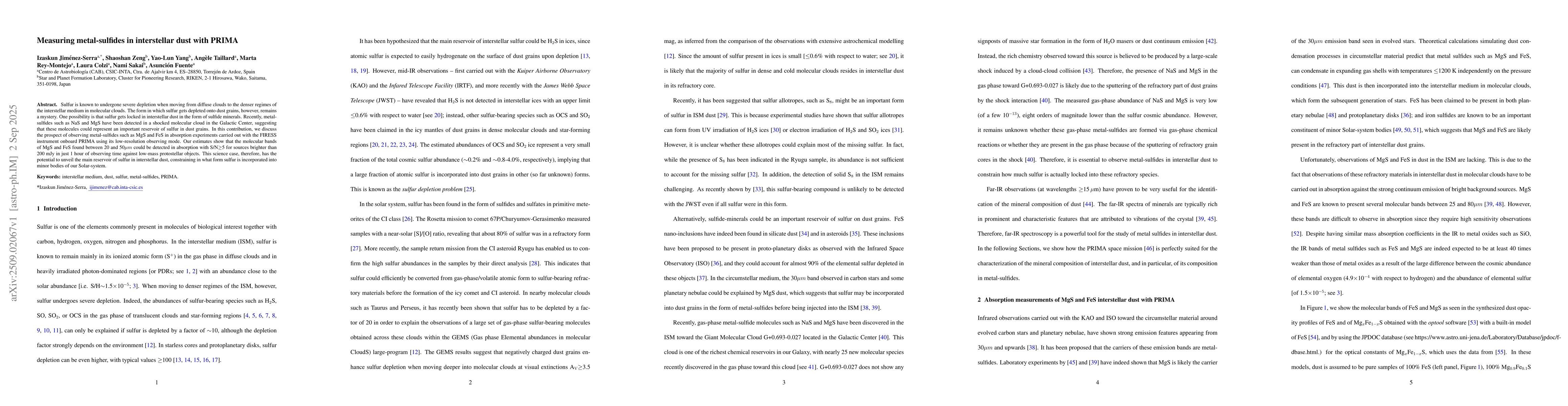 Sulfur is known to undergo severe depletion when moving from diffuse clouds to the denser regimes of the interstellar medium in molecular clouds. The form in which sulfur gets depleted onto dust grains, however, remains a mystery. One possibility is that sulfur gets locked in interstellar dust in the form of sulfide minerals. Recently, metal sulfides such as NaS and MgS have been detected in a shocked molecular cloud in the Galactic Center, suggesting that these molecules could represent an important reservoir of sulfur in dust grains. In this contribution, we discuss the prospect of observing metal sulfides such as MgS and FeS in absorption experiments carried out with the FIRESS instrument onboard PRIMA using its low resolution observing mode. Our estimates show that the molecular bands of MgS and FeS found between 20 and 50 ${\mu}$m could be detected in absorption with S/N ${\geq}$ 5 for sources brighter than 200 mJy in just 1 h of observing time against low-mass protostellar objects. This science case, therefore, has the potential to unveil the main reservoir of sulfur in interstellar dust, constraining in what form sulfur is incorporated into minor bodies of our solar system.