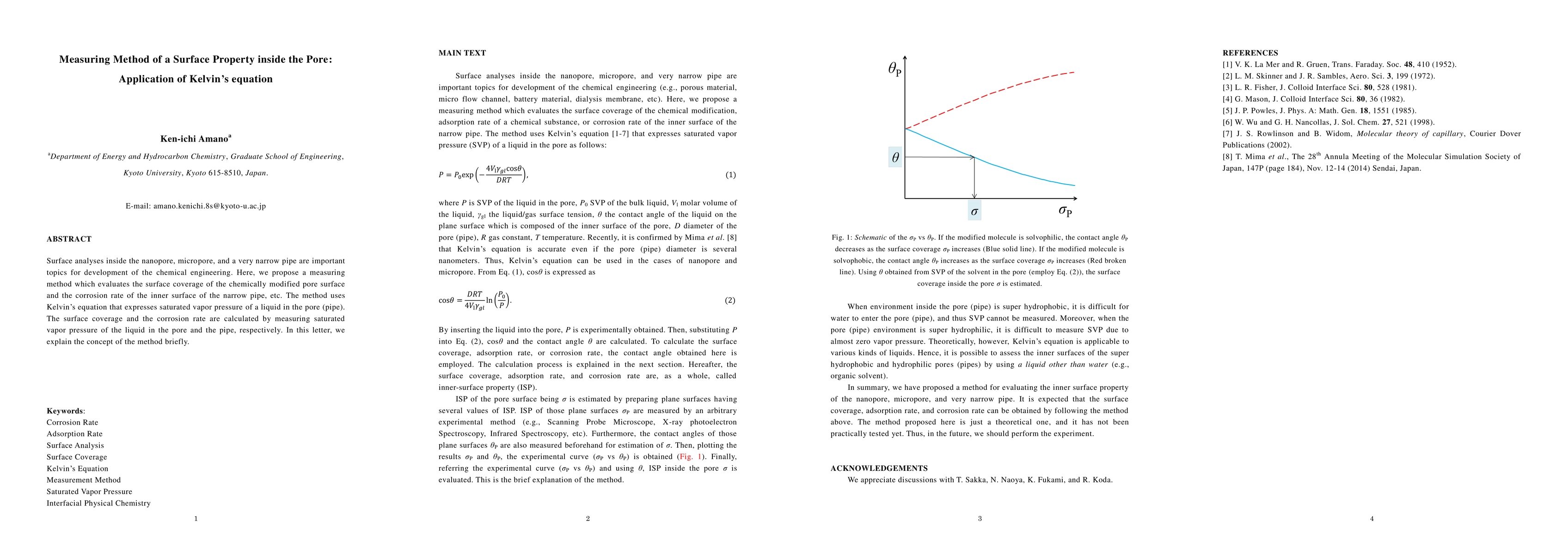 Surface analyses inside the nanopore, micropore, and a very narrow pipe are important topics for development of the chemical engineering. Here, we propose a measuring method which evaluates the surface coverage of the chemically modified pore surface and the corrosion rate of the inner surface of the narrow pipe, etc. The method uses Kelvin's equation that expresses saturated vapor pressure of a liquid in the pore (pipe). The surface coverage and the corrosion rate are calculated by measuring saturated vapor pressure of the liquid in the pore and the pipe, respectively. In this letter, we explain the concept of the method briefly.