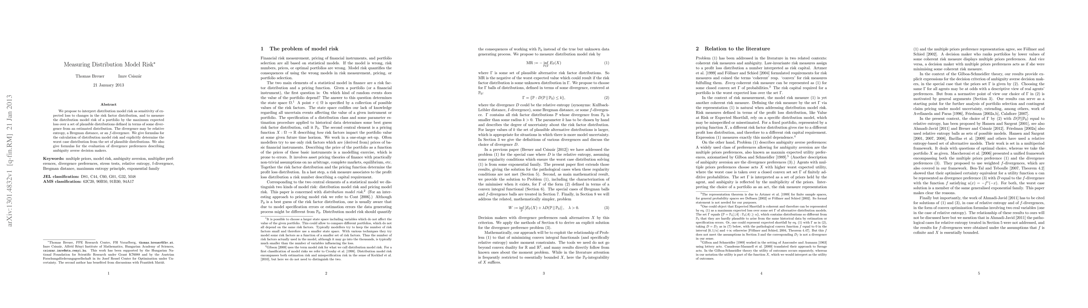 A new method is proposed to measure 'distribution model risk' as sensitivity of expected loss to changes in a risk factor distribution, using divergence measures like relative entropy or Bregman distance.