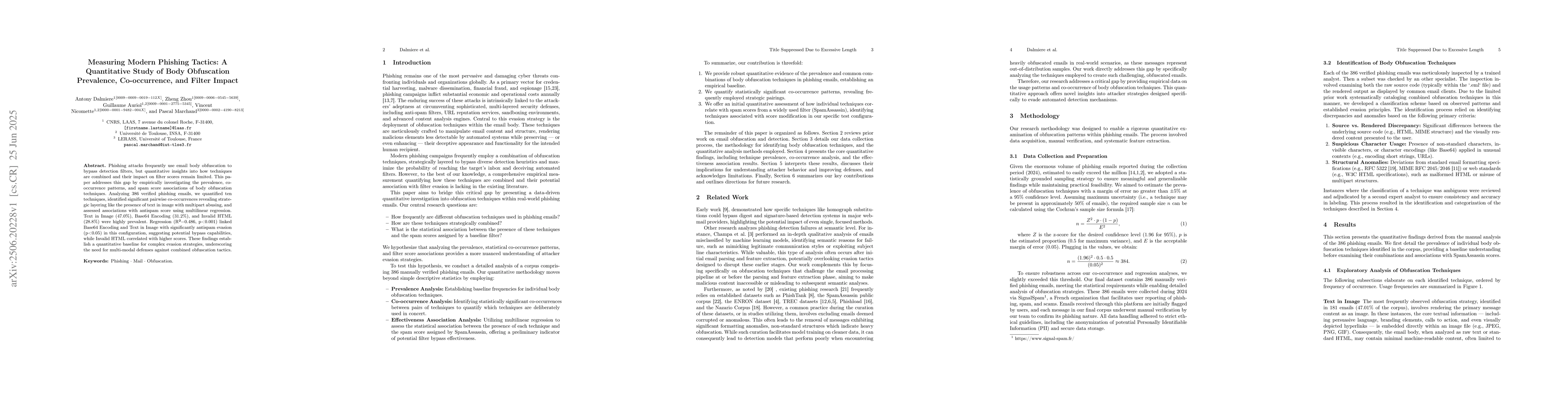 Phishing attacks frequently use email body obfuscation to bypass detection filters, but quantitative insights into how techniques are combined and their impact on filter scores remain limited. This paper addresses this gap by empirically investigating the prevalence, co-occurrence patterns, and spam score associations of body obfuscation techniques. Analysing 386 verified phishing emails, we quantified ten techniques, identified significant pairwise co-occurrences revealing strategic layering like the presence of text in images with multipart abuse, and assessed associations with antispam scores using multilinear regression. Text in Image (47.0%), Base64 Encoding (31.2%), and Invalid HTML (28.8%) were highly prevalent. Regression (R${}^2$=0.486, p<0.001) linked Base64 Encoding and Text in Image with significant antispam evasion (p<0.05) in this configuration, suggesting potential bypass capabilities, while Invalid HTML correlated with higher scores. These findings establish a quantitative baseline for complex evasion strategies, underscoring the need for multi-modal defences against combined obfuscation tactics.