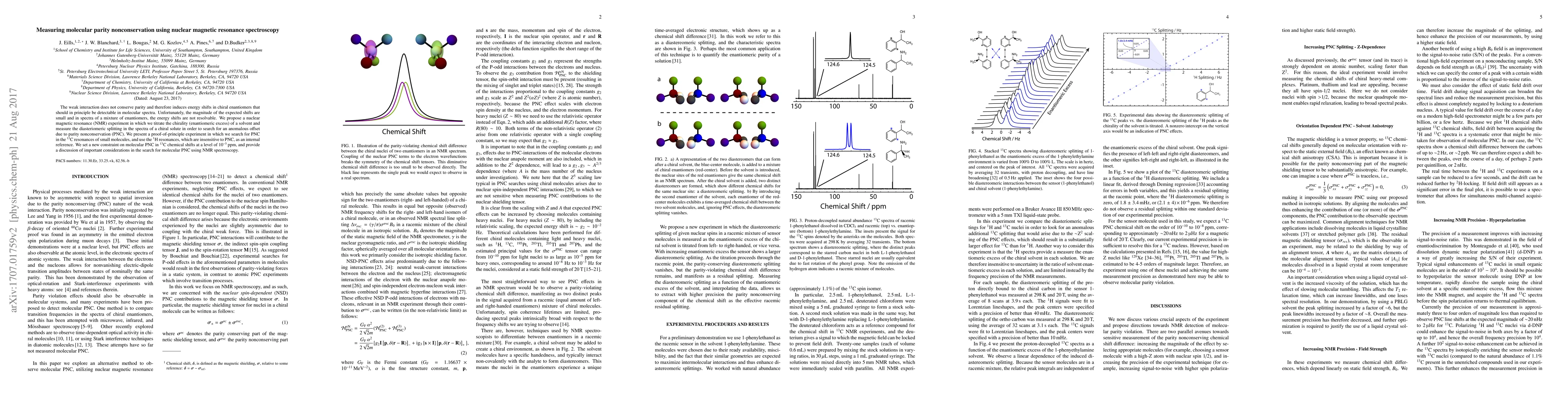 This paper proposes a nuclear magnetic resonance (NMR) experiment to detect molecular parity nonconservation by titrating chirality in a solvent and measuring splitting in the spectra of a chiral solute. The study sets a new constraint on \textsuperscript{13}C chemical shifts due to parity nonconservation at a level of $10^{-5}$ ppm.