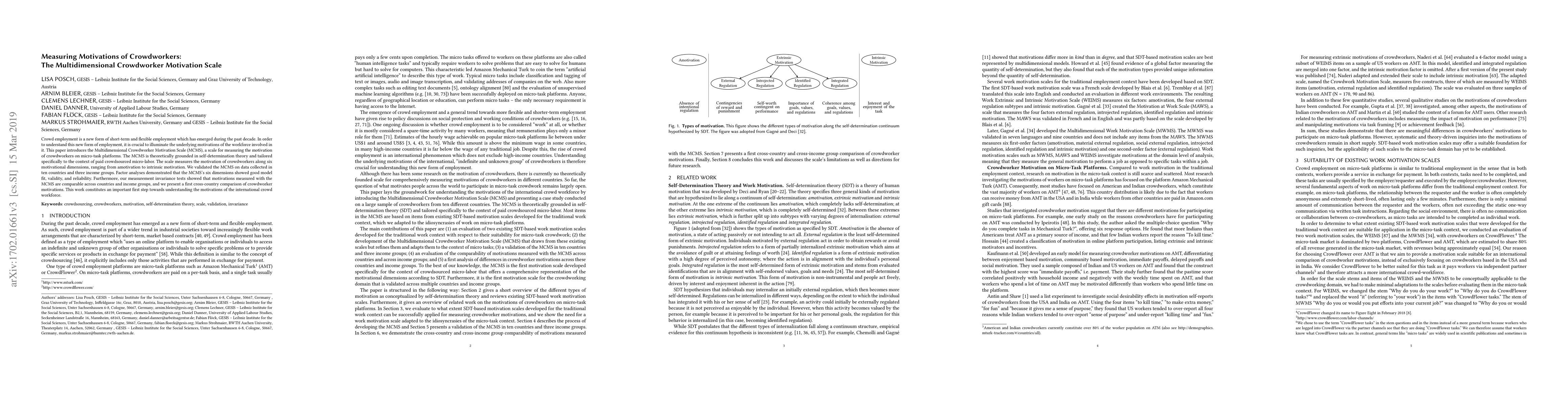 This paper introduces the Multidimensional Crowdworker Motivation Scale (MCMS) to measure the motivations of crowdworkers on micro-task platforms, grounded in self-determination theory. The MCMS, validated across ten countries and three income groups, demonstrates good model fit, validity, and reliability, providing a comparative analysis of crowdworker motivations globally.