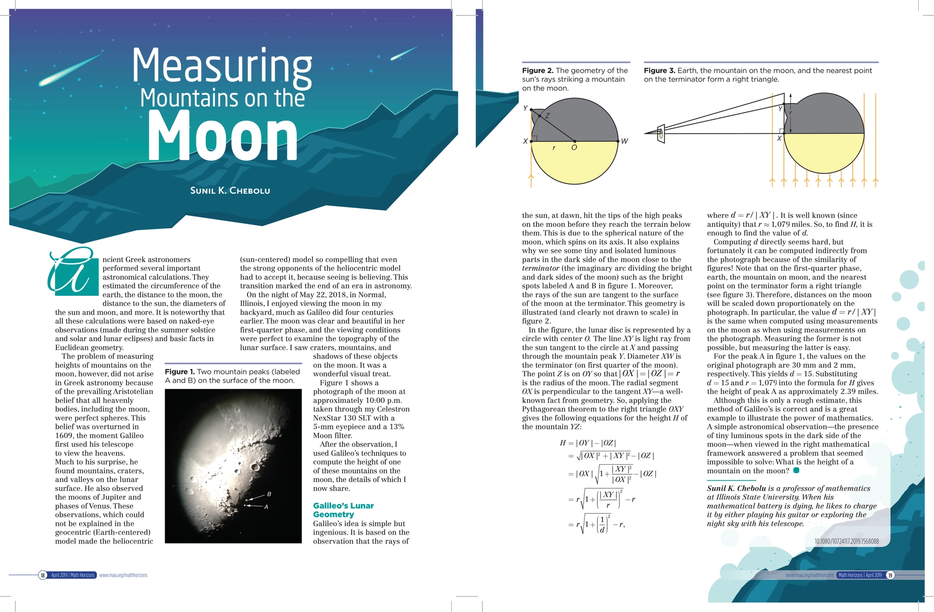 This paper details a method to measure lunar mountain heights, inspired by Galileo's approach. It utilizes the unique alignment of Earth, Moon, and Sun during a half Moon phase, forming a right triangle with the Moon as the right angle, enabling precise height calculations.