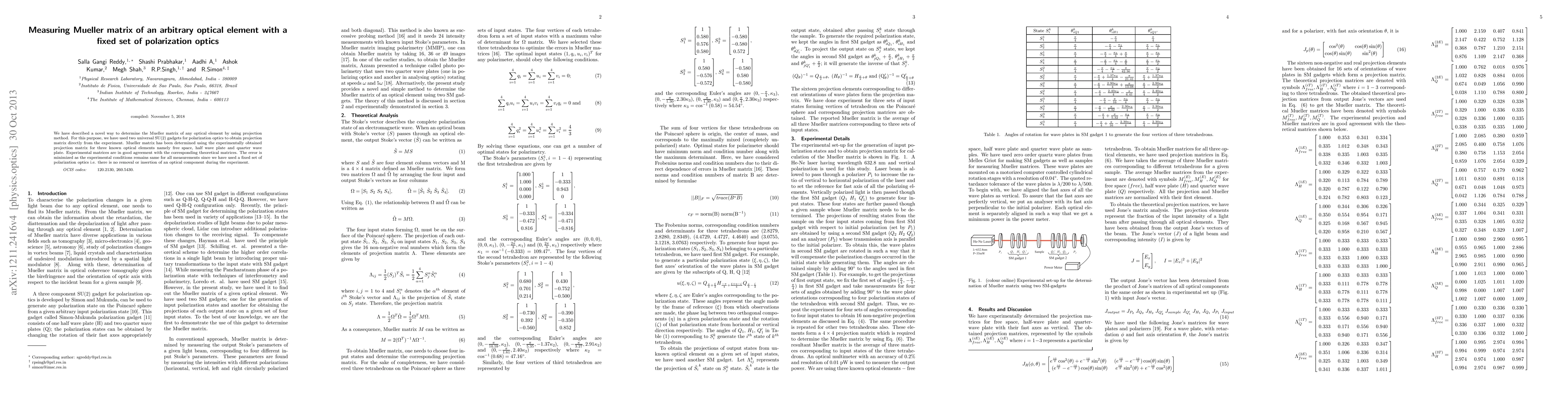We have described a novel way to determine the Mueller matrix of any optical element by using projection method. For this purpose, we have used two universal SU(2) gadgets for polarization optics to obtain projection matrix directly from the experiment. Mueller matrix has been determined using the experimentally obtained projection matrix for three known optical elements namely free space, half wave plate and quarter wave plate. Experimental matrices are in good agreement with the corresponding theoretical matrices. The error is minimized as the experimental conditions remains same for all measurements since we have used a fixed set of polarization optics i.e. there is no removal or insertion of an optical component during the experiment.
