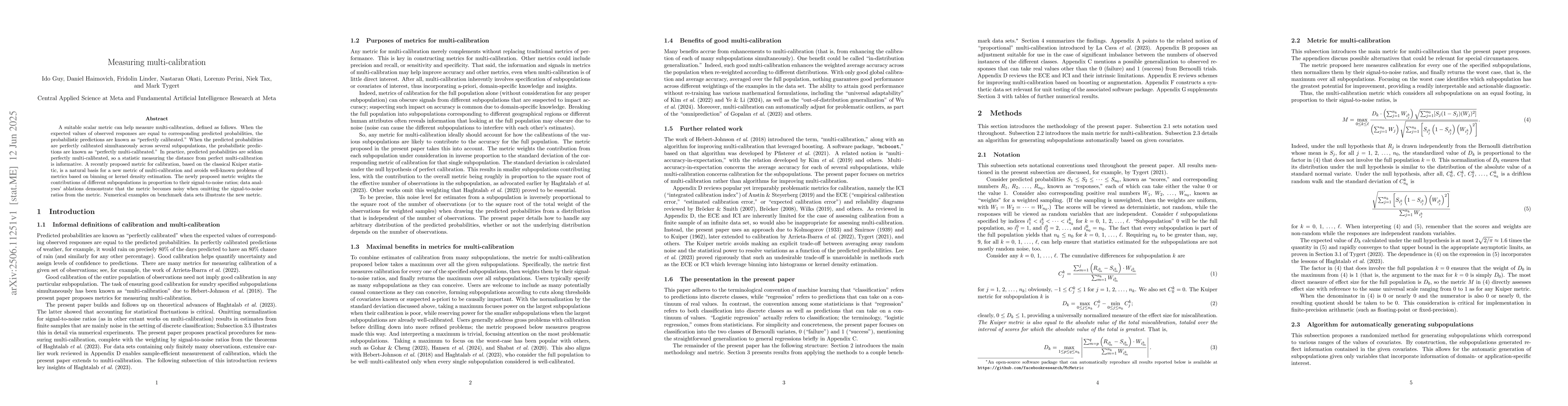 A suitable scalar metric can help measure multi-calibration, defined as follows. When the expected values of observed responses are equal to corresponding predicted probabilities, the probabilistic predictions are known as "perfectly calibrated." When the predicted probabilities are perfectly calibrated simultaneously across several subpopulations, the probabilistic predictions are known as "perfectly multi-calibrated." In practice, predicted probabilities are seldom perfectly multi-calibrated, so a statistic measuring the distance from perfect multi-calibration is informative. A recently proposed metric for calibration, based on the classical Kuiper statistic, is a natural basis for a new metric of multi-calibration and avoids well-known problems of metrics based on binning or kernel density estimation. The newly proposed metric weights the contributions of different subpopulations in proportion to their signal-to-noise ratios; data analyses' ablations demonstrate that the metric becomes noisy when omitting the signal-to-noise ratios from the metric. Numerical examples on benchmark data sets illustrate the new metric.