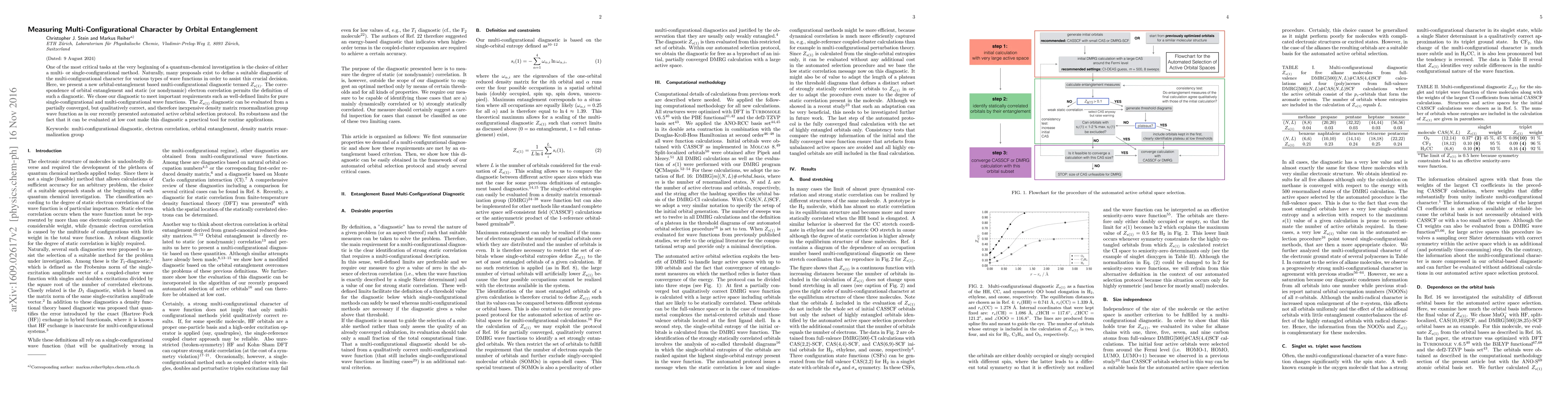 This paper introduces a new diagnostic, $Z_{s(1)}$, based on orbital entanglement to measure the multi-configurational character in quantum chemical investigations, offering a low-cost, practical tool for determining the appropriate wave function method. The diagnostic aligns with static electron correlation and meets criteria for pure single- and multi-configurational wave functions.