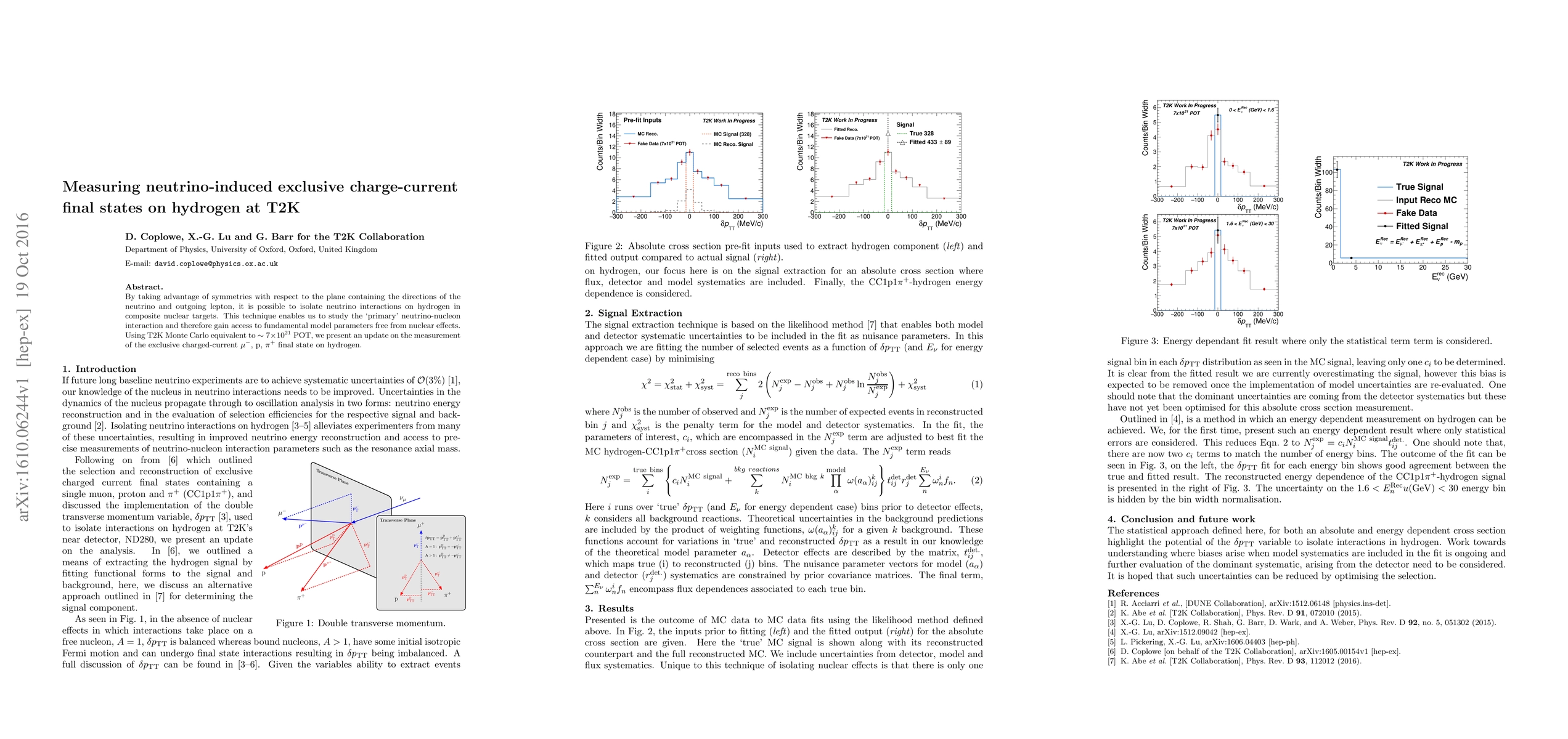 Researchers at T2K used a technique to isolate neutrino interactions on hydrogen in composite nuclear targets, allowing them to study the primary neutrino-nucleon interaction and gain insights into fundamental model parameters. The team presents an update on measuring exclusive charged-current final states on hydrogen with approximately $7 imes 10^{21}$ proton-on-target events.