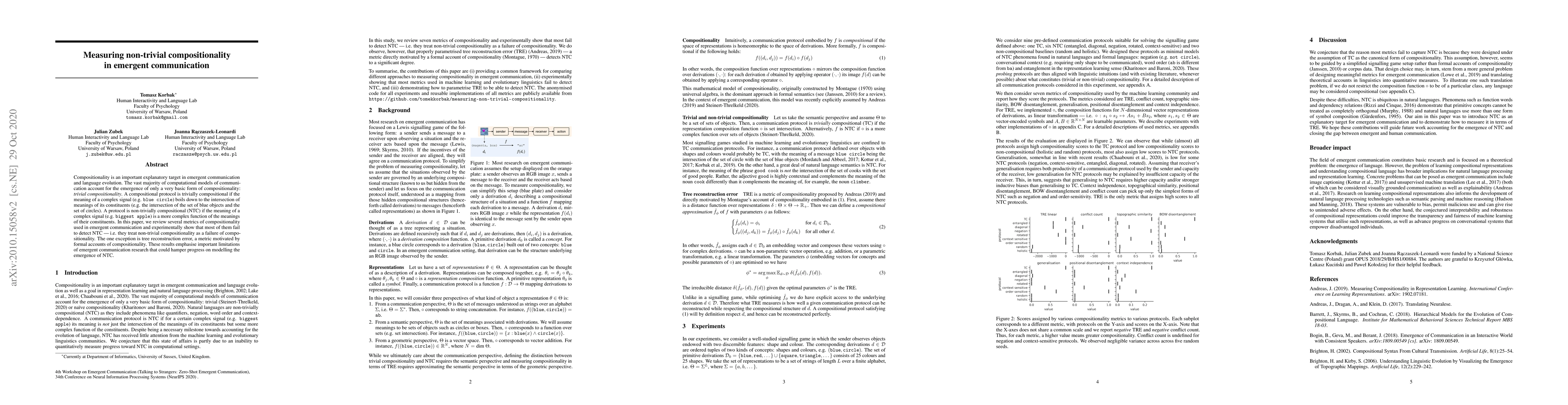 This paper reviews metrics for compositionality in emergent communication, finding that most fail to detect non-trivial compositionality, which requires complex signal meanings beyond simple intersections of constituents. Tree reconstruction error is highlighted as the exception, underscoring significant gaps in current research.