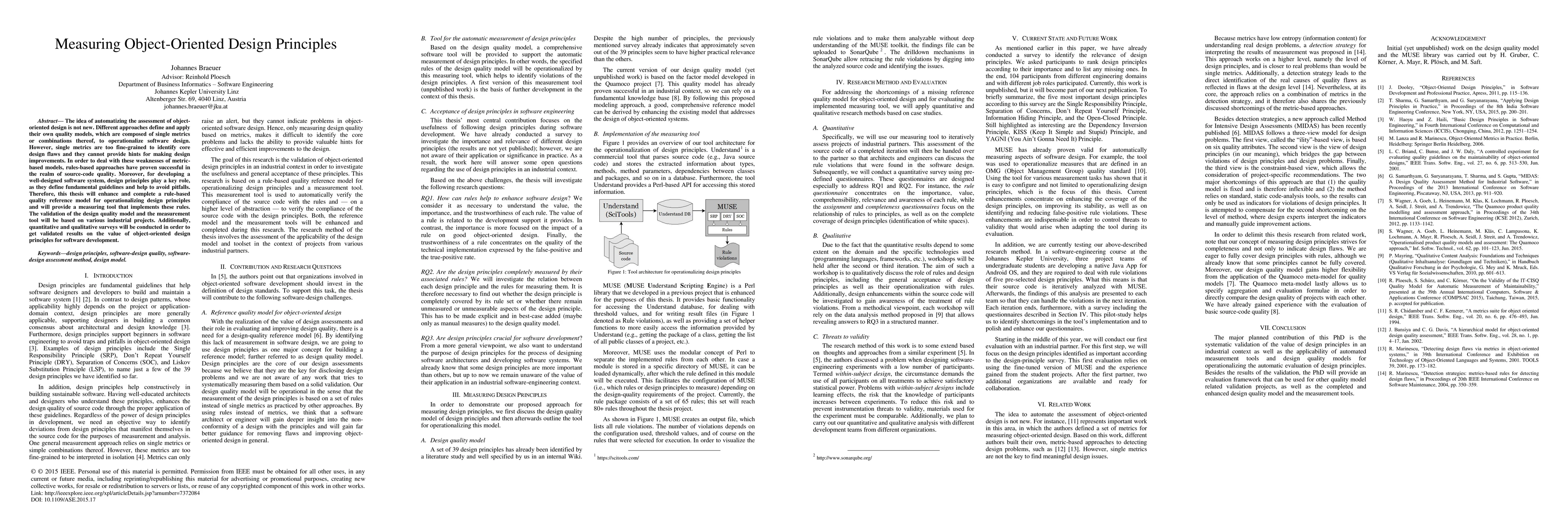 The idea of automatizing the assessment of objectoriented design is not new. Different approaches define and apply their own quality models, which are composed of single metrics or combinations thereof, to operationalize software design. However, single metrics are too fine-grained to identify core design flaws and they cannot provide hints for making design improvements. In order to deal with these weaknesses of metric-based models, rules-based approaches have proven successful in the realm of source-code quality. Moreover, for developing a well-designed software system, design principles play a key role, as they define fundamental guidelines and help to avoid pitfalls. Therefore, this thesis will enhance and complete a rule-based quality reference model for operationalizing design principles and will provide a measuring tool that implements these rules. The validation of the design quality model and the measurement tool will be based on various industrial projects. Additionally, quantitative and qualitative surveys will be conducted in order to get validated results on the value of object-oriented design principles for software development