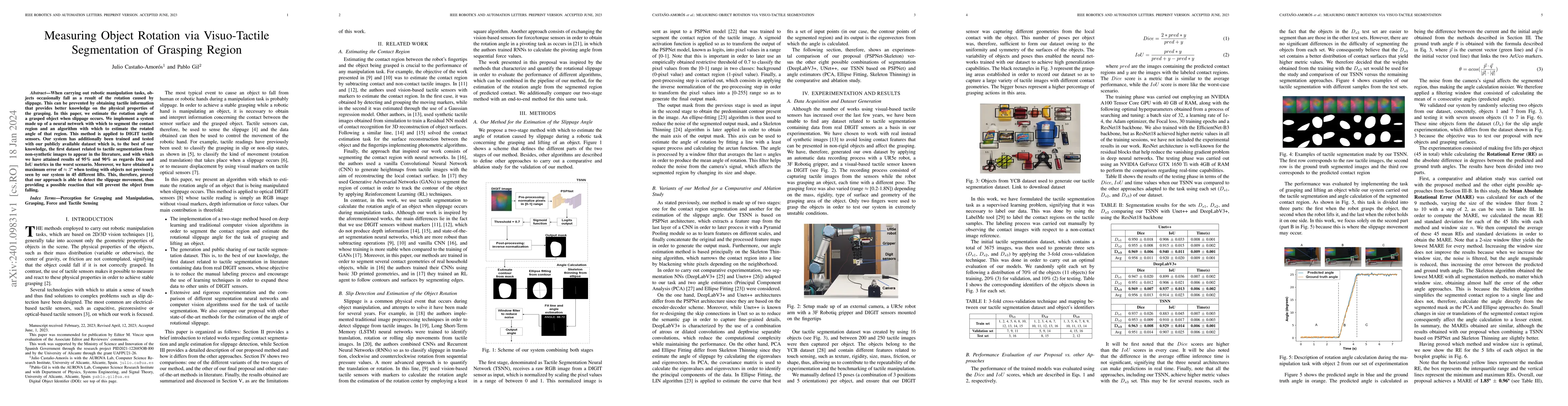 When carrying out robotic manipulation tasks, objects occasionally fall as a result of the rotation caused by slippage. This can be prevented by obtaining tactile information that provides better knowledge on the physical properties of the grasping. In this paper, we estimate the rotation angle of a grasped object when slippage occurs. We implement a system made up of a neural network with which to segment the contact region and an algorithm with which to estimate the rotated angle of that region. This method is applied to DIGIT tactile sensors. Our system has additionally been trained and tested with our publicly available dataset which is, to the best of our knowledge, the first dataset related to tactile segmentation from non-synthetic images to appear in the literature, and with which we have attained results of 95% and 90% as regards Dice and IoU metrics in the worst scenario. Moreover, we have obtained a maximum error of 3 degrees when testing with objects not previously seen by our system in 45 different lifts. This, therefore, proved that our approach is able to detect the slippage movement, thus providing a possible reaction that will prevent the object from falling.
