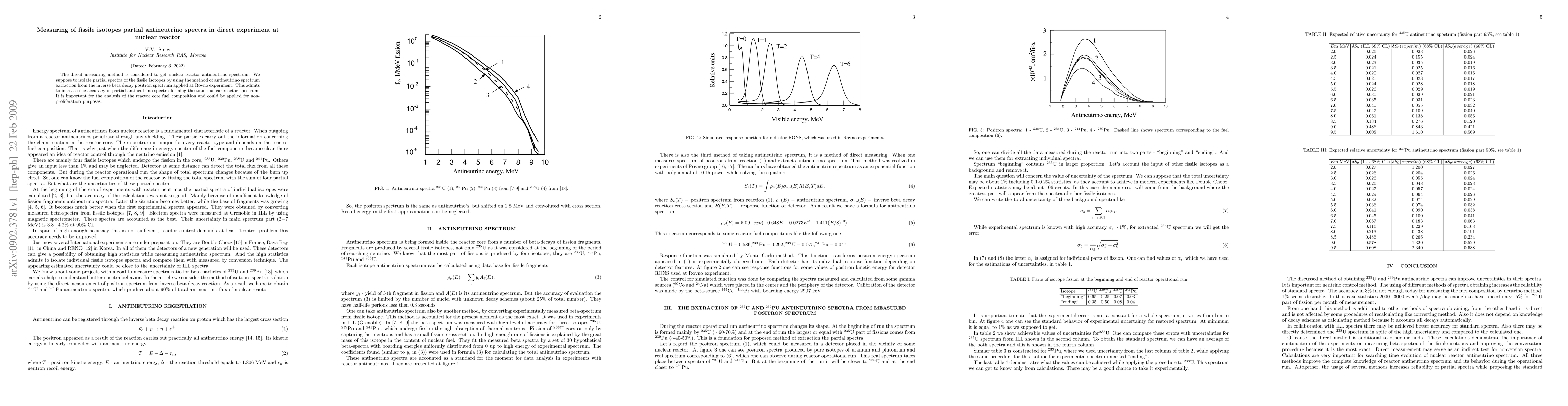 The direct measuring method is considered to get nuclear reactor antineutrino spectrum. We suppose to isolate partial spectra of the fissile isotopes by using the method of antineutrino spectrum extraction from the inverse beta decay positron spectrum applied at Rovno experiment. This admits to increase the accuracy of partial antineutrino spectra forming the total nuclear reactor spectrum. It is important for the analysis of the reactor core fuel composition and could be applied for non-proliferation purposes.