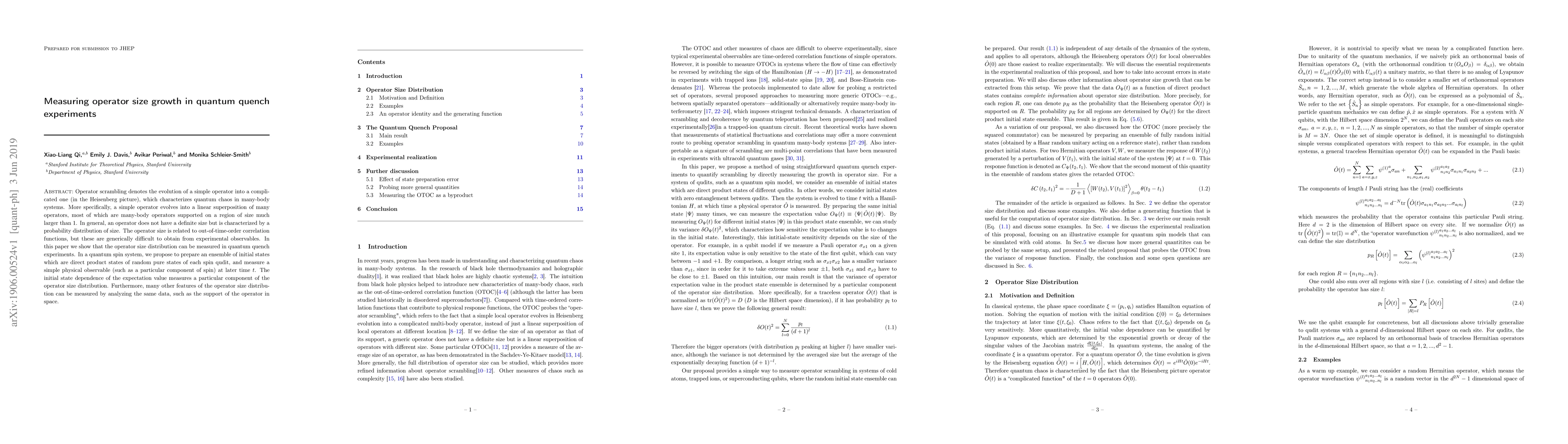 Researchers developed a method to measure operator size growth in quantum quench experiments, allowing for a better understanding of quantum chaos and many-body systems. By analyzing data from spin system experiments, they can quantify features of the operator size distribution.