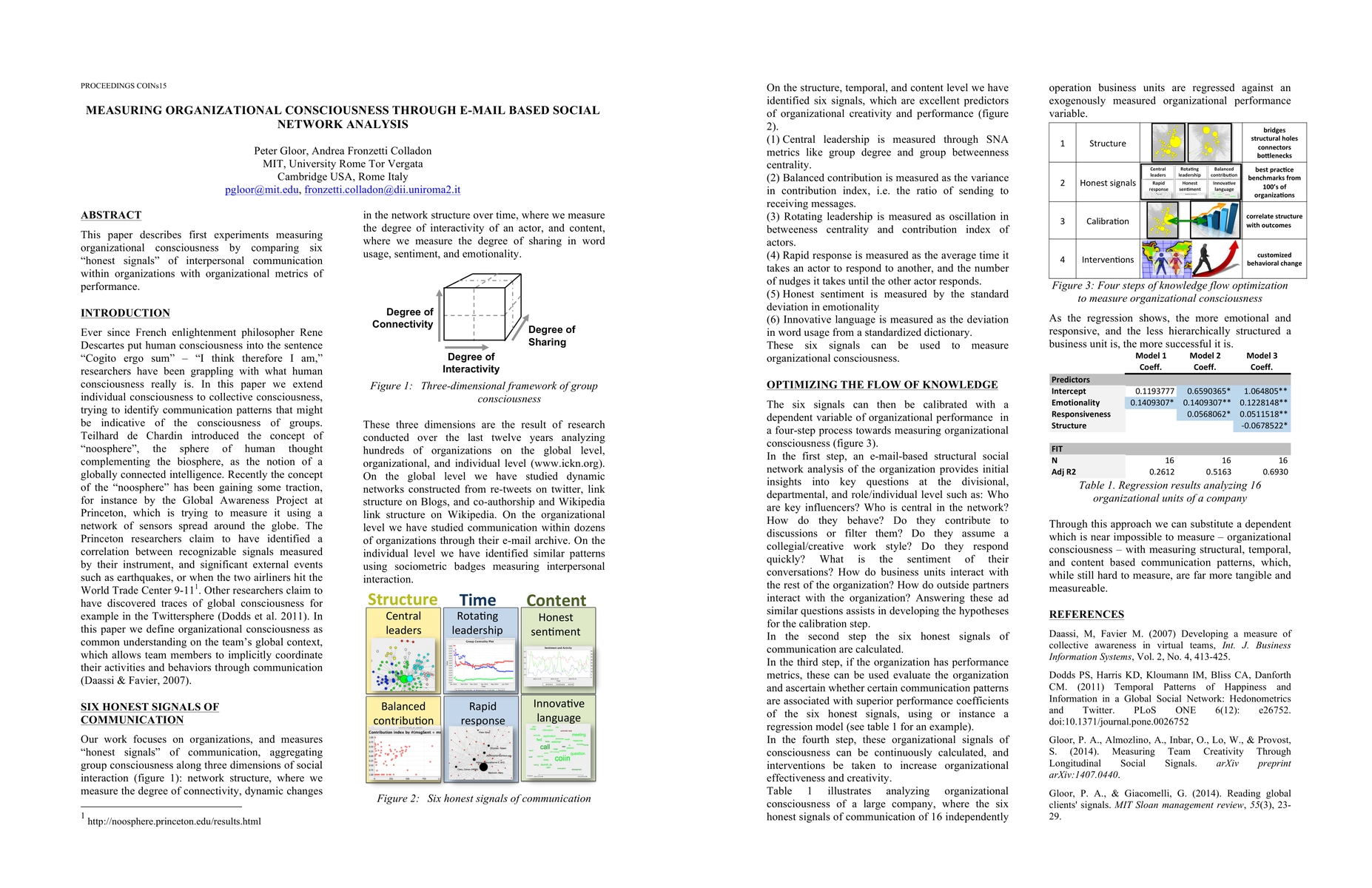 This paper describes first experiments measuring organizational consciousness by comparing six "honest signals" of interpersonal communication within organizations with organizational metrics of performance.