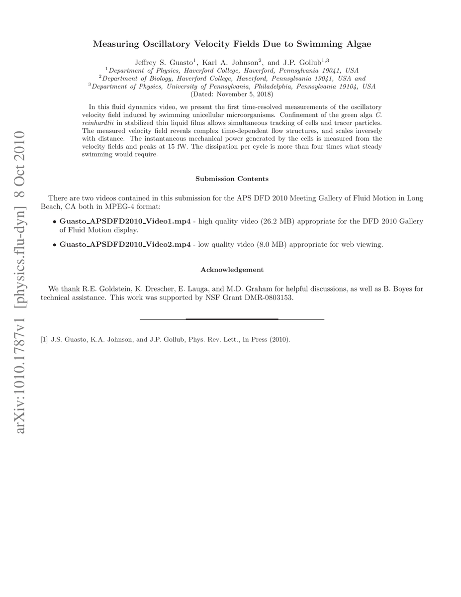 In this fluid dynamics video, we present the first time-resolved measurements of the oscillatory velocity field induced by swimming unicellular microorganisms. Confinement of the green alga C. reinhardtii in stabilized thin liquid films allows simultaneous tracking of cells and tracer particles. The measured velocity field reveals complex time-dependent flow structures, and scales inversely with distance. The instantaneous mechanical power generated by the cells is measured from the velocity fields and peaks at 15 fW. The dissipation per cycle is more than four times what steady swimming would require.