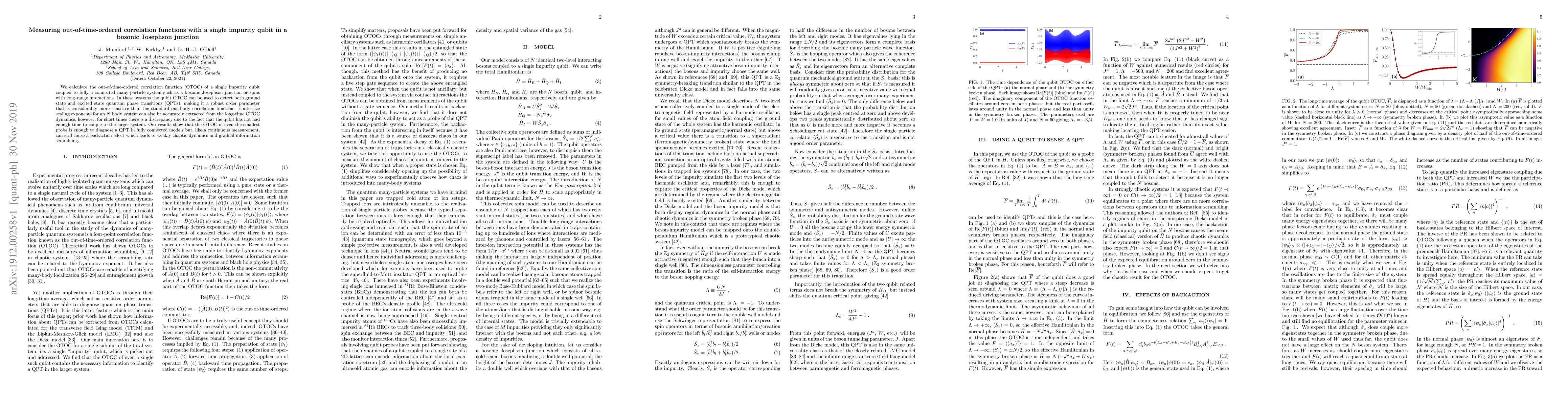 We calculate the out-of-time-ordered correlation function (OTOC) of a single impurity qubit coupled to fully a connected many-particle system such as a bosonic Josephson junction or spins with long-range interactions. In these systems the qubit OTOC can be used to detect both ground state and excited state quantum phase transitions (QPTs), making it a robust order parameter that is considerably more sensitive than the standard one-body correlation function. Finite size scaling exponents for an $N$ body system can also be accurately extracted from the long-time OTOC dynamics, however, for short times there is a discrepancy due to the fact that the qubit has not had enough time to couple to the larger system. Our results show that the OTOC of even the smallest probe is enough to diagnose a QPT in fully connected models but, like a continuous measurement, can still cause a backaction effect which leads to weakly chaotic dynamics and gradual information scrambling.