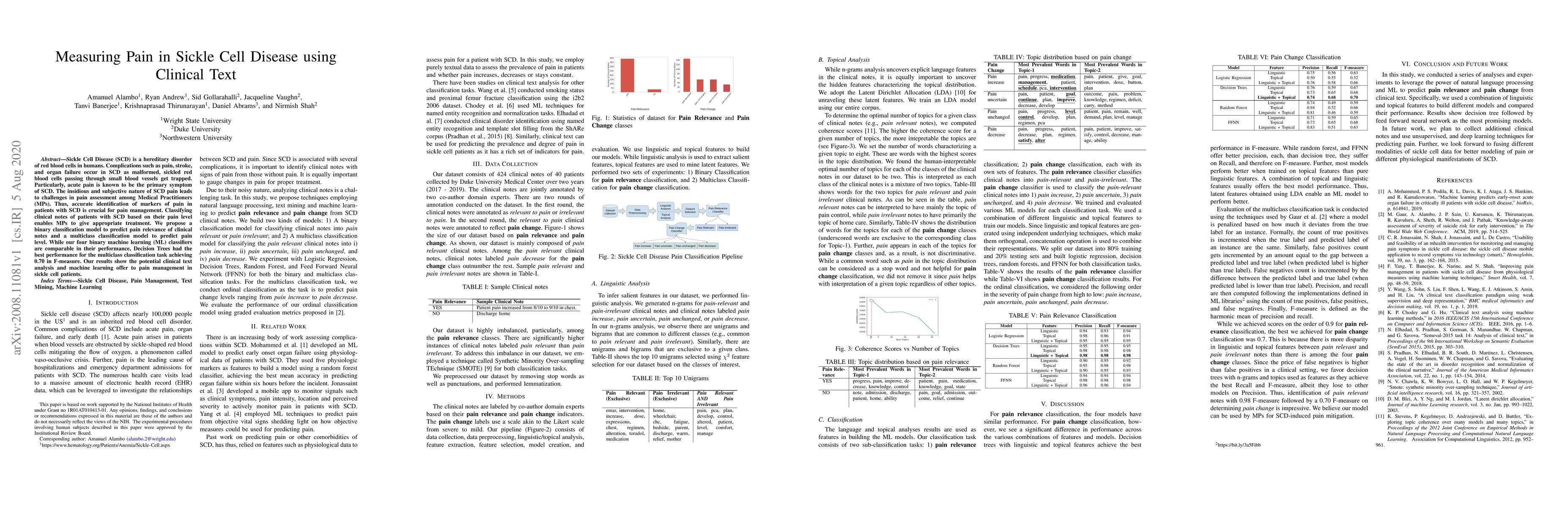 Sickle Cell Disease (SCD) is a hereditary disorder of red blood cells in humans. Complications such as pain, stroke, and organ failure occur in SCD as malformed, sickled red blood cells passing through small blood vessels get trapped. Particularly, acute pain is known to be the primary symptom of SCD. The insidious and subjective nature of SCD pain leads to challenges in pain assessment among Medical Practitioners (MPs). Thus, accurate identification of markers of pain in patients with SCD is crucial for pain management. Classifying clinical notes of patients with SCD based on their pain level enables MPs to give appropriate treatment. We propose a binary classification model to predict pain relevance of clinical notes and a multiclass classification model to predict pain level. While our four binary machine learning (ML) classifiers are comparable in their performance, Decision Trees had the best performance for the multiclass classification task achieving 0.70 in F-measure. Our results show the potential clinical text analysis and machine learning offer to pain management in sickle cell patients.