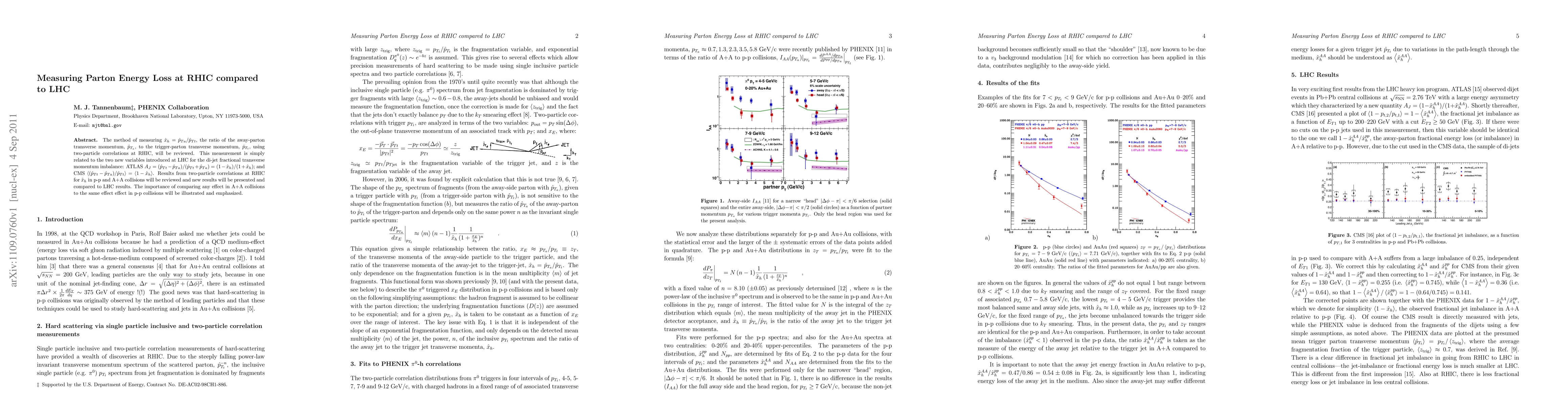 This paper reviews the method of measuring parton energy loss at RHIC using $\hat{x}_h$ and compares it with LHC's new variables $A_J$ and CMS $\mean{1-\hat{x}_h}$. It highlights the significance of comparing results from A+A and p-p collisions to understand the underlying physics.