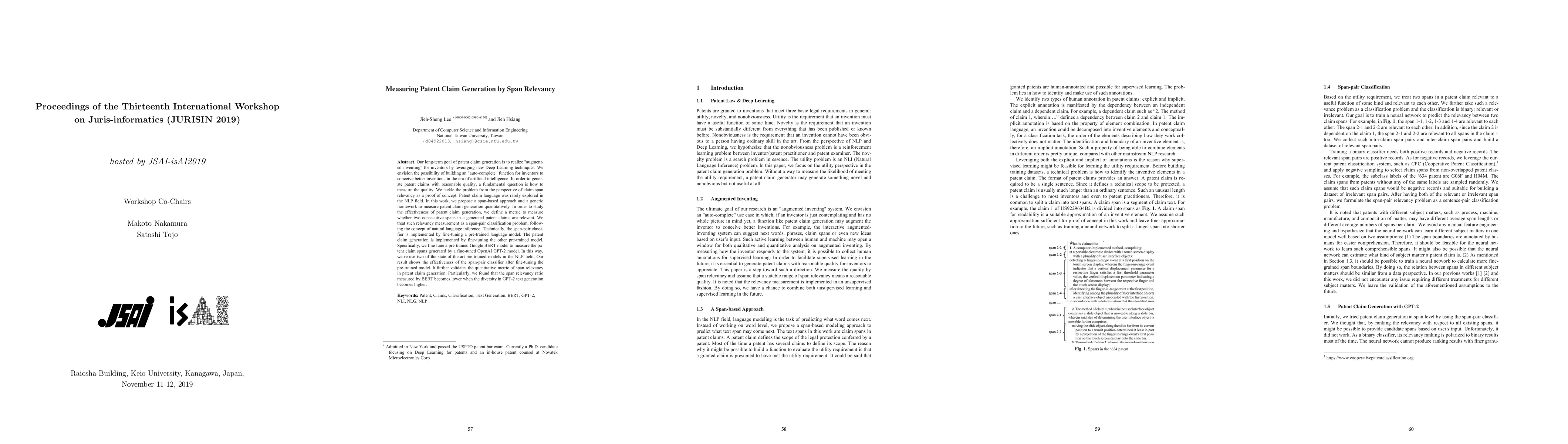 Our goal of patent claim generation is to realize "augmented inventing" for inventors by leveraging latest Deep Learning techniques. We envision the possibility of building an "auto-complete" function for inventors to conceive better inventions in the era of artificial intelligence. In order to generate patent claims with good quality, a fundamental question is how to measure it. We tackle the problem from a perspective of claim span relevancy. Patent claim language was rarely explored in the NLP field. It is unique in its own way and contains rich explicit and implicit human annotations. In this work, we propose a span-based approach and a generic framework to measure patent claim generation quantitatively. In order to study the effectiveness of patent claim generation, we define a metric to measure whether two consecutive spans in a generated patent claims are relevant. We treat such relevancy measurement as a span-pair classification problem, following the concept of natural language inference. Technically, the span-pair classifier is implemented by fine-tuning a pre-trained language model. The patent claim generation is implemented by fine-tuning the other pre-trained model. Specifically, we fine-tune a pre-trained Google BERT model to measure the patent claim spans generated by a fine-tuned OpenAI GPT-2 model. In this way, we re-use two of the state-of-the-art pre-trained models in the NLP field. Our result shows the effectiveness of the span-pair classifier after fine-tuning the pre-trained model. It further validates the quantitative metric of span relevancy in patent claim generation. Particularly, we found that the span relevancy ratio measured by BERT becomes lower when the diversity in GPT-2 text generation becomes higher.