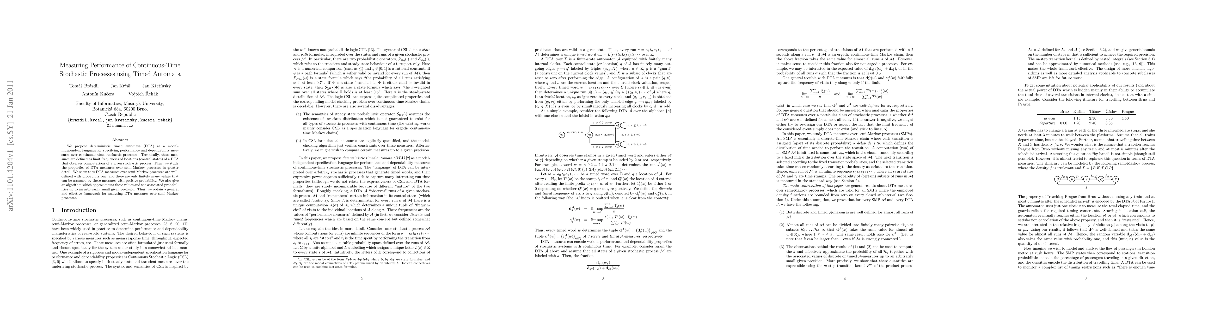 This paper introduces deterministic timed automata (DTA) as a model-independent framework for specifying performance and dependability measures over continuous-time stochastic processes. It demonstrates that DTA measures over semi-Markov processes are well-defined and finite, providing an algorithm to approximate these measures with high precision.