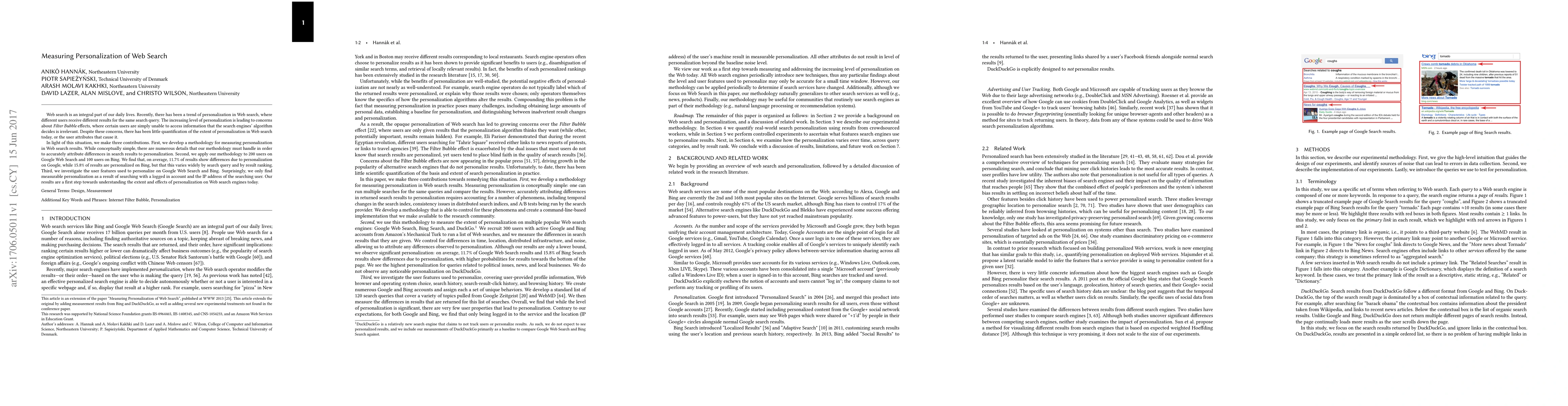 This paper develops a methodology to measure personalization in web search results, applying it to Google and Bing for 200 and 100 users respectively. It finds that on average, 11.7% and 15.8% of results are personalized on Google and Bing, respectively, with significant variation by query and ranking. The study identifies logged-in accounts and IP addresses as primary factors for personalization.