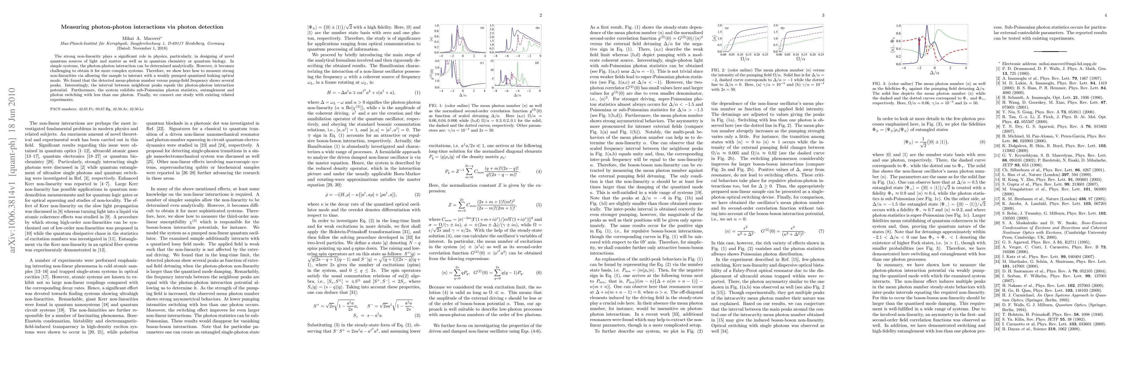This paper presents a method to measure photon-photon interactions in complex systems using a weakly pumped quantized optical mode, revealing peaks in detected mean-photon number versus pump-field frequency that correspond to the photon-photon interaction potential. The study also observes sub-Poissonian photon statistics, entanglement, and photon switching with minimal photons, linking these findings to existing experimental results.