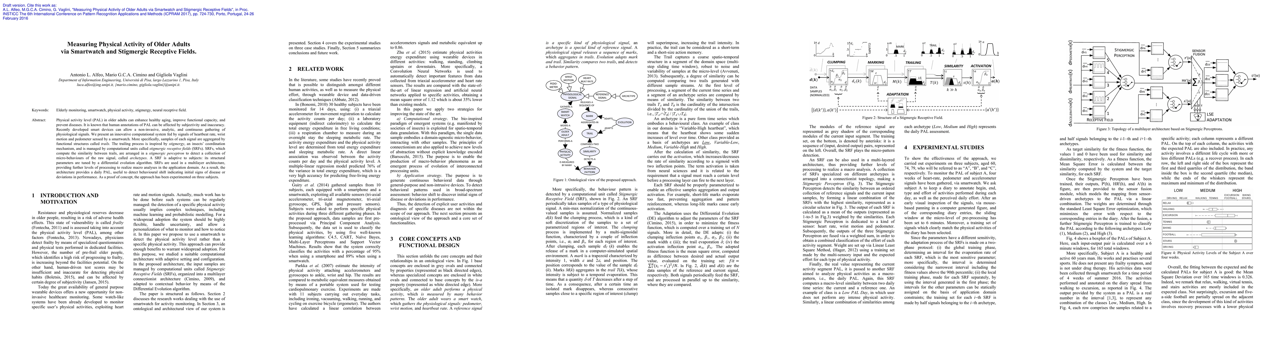 Physical activity level (PAL) in older adults can enhance healthy aging, improve functional capacity, and prevent diseases. It is known that human annotations of PAL can be affected by subjectivity and inaccuracy. Recently developed smart devices can allow a non-invasive, analytic, and continuous gathering of physiological signals. We present an innovative computational system fed by signals of heartbeat rate, wrist motion and pedometer sensed by a smartwatch. More specifically, samples of each signal are aggregated by functional structures called trails. The trailing process is inspired by stigmergy, an insects' coordination mechanism, and is managed by computational units called stigmergic receptive fields (SRFs). SRFs, which compute the similarity between trails, are arranged in a stigmergic perceptron to detect a collection of micro-behaviours of the raw signal, called archetypes. A SRF is adaptive to subjects: its structural parameters are tuned by a differential evolution algorithm. SRFs are used in a multilayer architecture, providing further levels of processing to realize macro analyses in the application domain. As a result, the architecture provides a daily PAL, useful to detect behavioural shift indicating initial signs of disease or deviations in performance. As a proof of concept, the approach has been experimented on three subjects.
