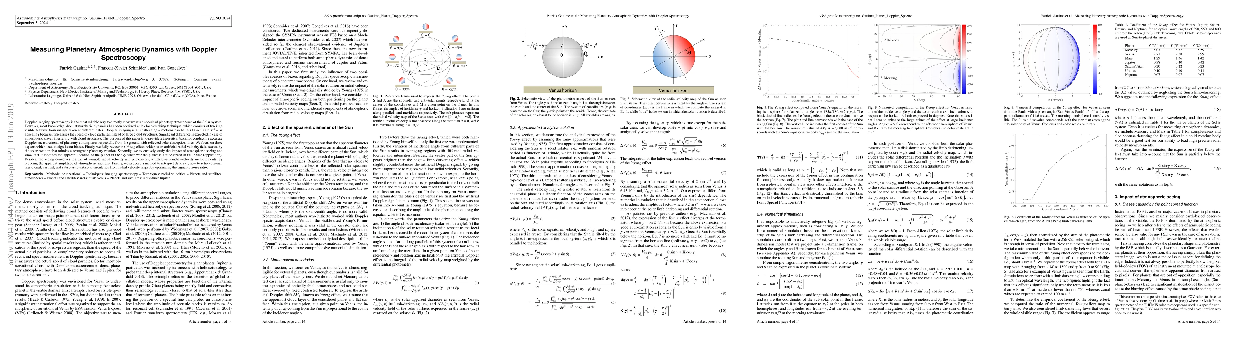 The research offers a comprehensive review and refinement of the Young effect, along with an in-depth study of atmospheric seeing's impact on Doppler measurements, providing a novel approach to interpreting radial velocity maps for planetary atmospheric dynamics.