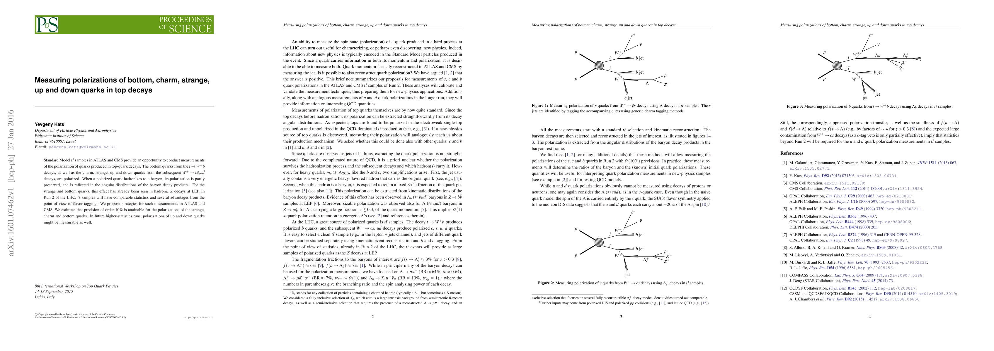 Standard Model $t\bar t$ samples in ATLAS and CMS provide an opportunity to conduct measurements of the polarization of quarks produced in top-quark decays. The bottom quarks from the $t \to W^+ b$ decays, as well as the charm, strange, up and down quarks from the subsequent $W^+ \to c\bar s, u\bar d$ decays, are polarized. When a polarized quark hadronizes to a baryon, its polarization is partly preserved, and is reflected in the angular distributions of the baryon decay products. For the strange and bottom quarks, this effect has already been seen in hadronic $Z$ decays at LEP. In Run 2 of the LHC, $t\bar t$ samples will have comparable statistics and several advantages from the point of view of flavor tagging. We propose strategies for such measurements in ATLAS and CMS. We estimate that precision of order $10\%$ is attainable for the polarizations of the strange, charm and bottom quarks. In future higher-statistics runs, polarizations of up and down quarks might be measurable as well.
