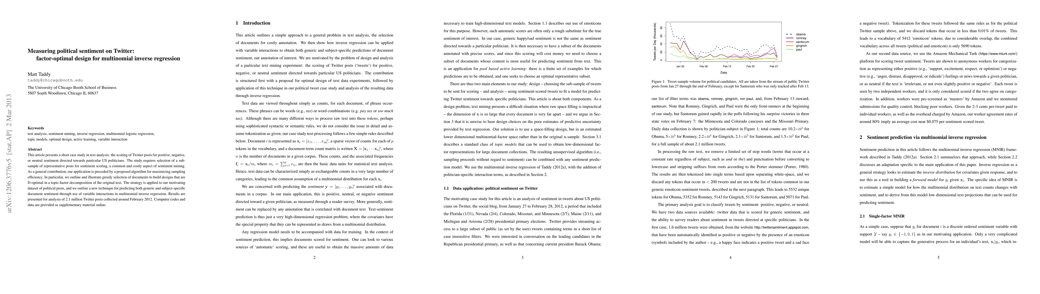 This article presents a short case study in text analysis: the scoring of Twitter posts for positive, negative, or neutral sentiment directed towards particular US politicians. The study requires selection of a sub-sample of representative posts for sentiment scoring, a common and costly aspect of sentiment mining. As a general contribution, our application is preceded by a proposed algorithm for maximizing sampling efficiency. In particular, we outline and illustrate greedy selection of documents to build designs that are D-optimal in a topic-factor decomposition of the original text. The strategy is applied to our motivating dataset of political posts, and we outline a new technique for predicting both generic and subject-specific document sentiment through use of variable interactions in multinomial inverse regression. Results are presented for analysis of 2.1 million Twitter posts around February 2012.