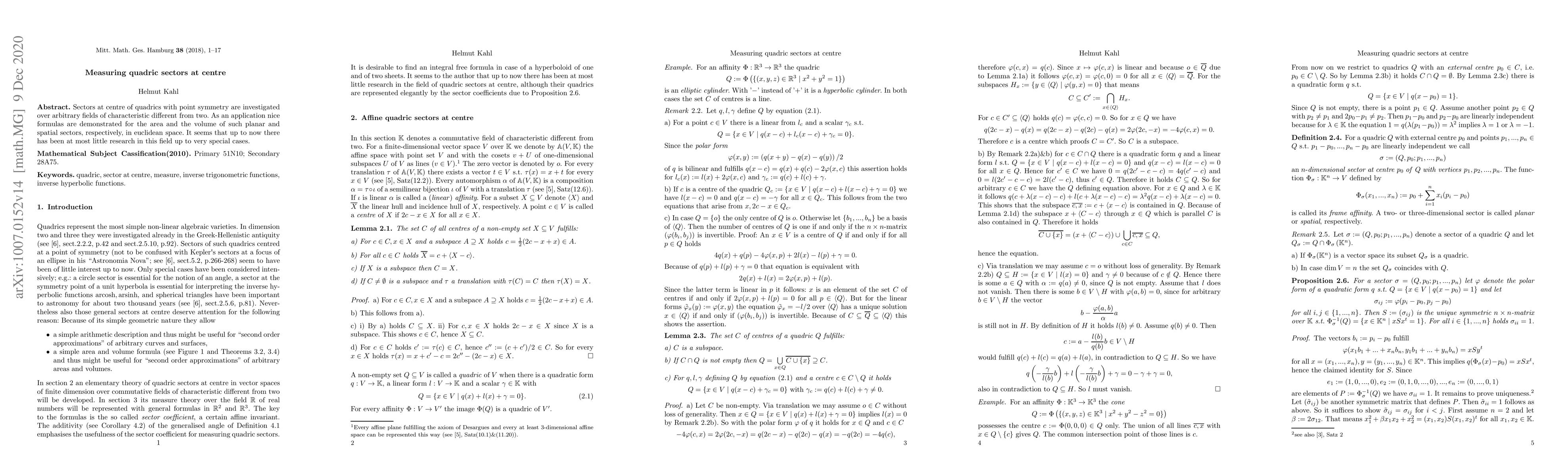 This paper investigates sectors at the center of affine quadrics with point symmetry over fields of characteristic different from two, deriving new formulas for their area and volume in Euclidean space. It highlights a gap in prior research, suggesting limited prior studies on this topic.