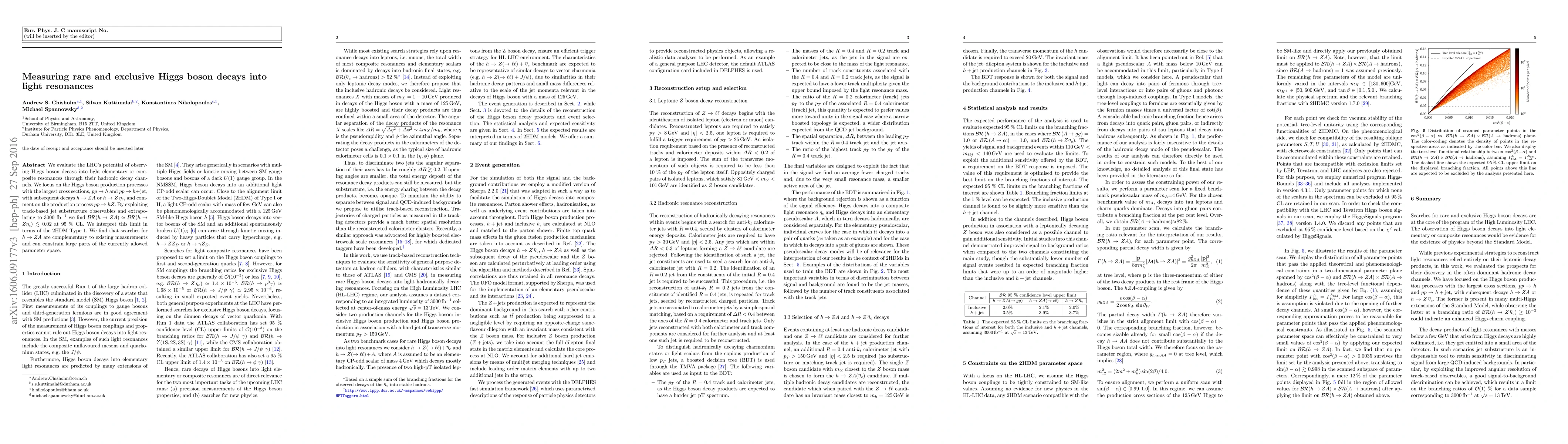 This paper assesses the Large Hadron Collider's capability to detect rare Higgs boson decays into light resonances via hadronic decay channels, focusing on processes with significant cross sections. The study finds that the branching ratios for these decays are constrained to be less than 0.02 at 95% confidence level, providing new insights into the 2HDM Type 1 model.