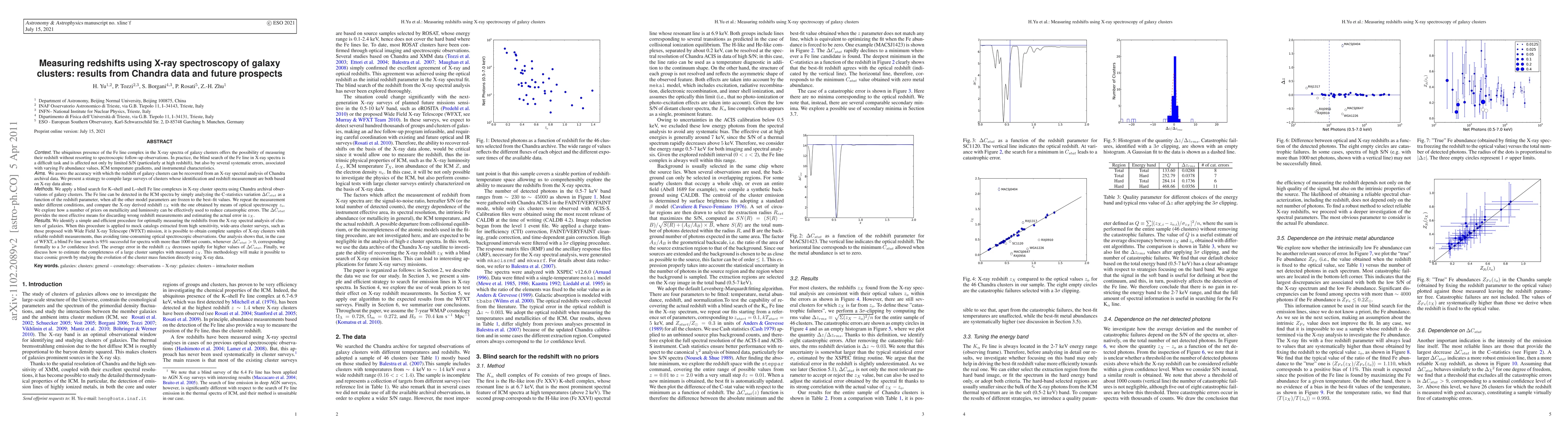 The ubiquitous presence of the Fe line complex in the X-ray spectra of galaxy clusters offers the possibility of measuring their redshift without resorting to spectroscopic follow-up observations. In this paper we assess the accuracy with which the redshift of galaxy clusters can be recovered from an X-ray spectral analysis of Chandra archival data. This study indicates a strategy to build large surveys of clusters whose identification and redshift measurement are both based on X-ray data alone. We apply a blind search for K--shell and L--shell Fe line complex in X-ray cluster spectra using Chandra archival observations of galaxy clusters. The Fe line in the ICM spectra can be detected by simply analyzing the C-statistics variation $\Delta C_{stat}$ as a function of the redshift parameter. We repeat the measurement under different conditions, and compare the X-ray derived redshift $z_X$ with the one obtained by means of optical spectroscopy $z_o$. We explore how a number of priors on metallicity and luminosity can be effectively used to reduce catastrophic errors. The $\Delta C_{stat}$ provides the most efficient means for discarding wrong redshift measures and to estimate the actual error on $z_X$. We identify a simple and efficient procedure for optimally measuring the redshifts from the X-ray spectral analysis of clusters of galaxies. When this procedure is applied to mock catalogs extracted from high sensitivity, wide-area cluster surveys, such as those proposed with Wide Field X-ray Telescope (WFXT) mission, it is possible to obtain a complete samples of X-ray clusters with reliable redshift measurements, thus avoiding time-consuming optical spectroscopic observations. This methodology will make it possible to trace cosmic growth by studying the evolution of the cluster mass function directly using X-ray data.