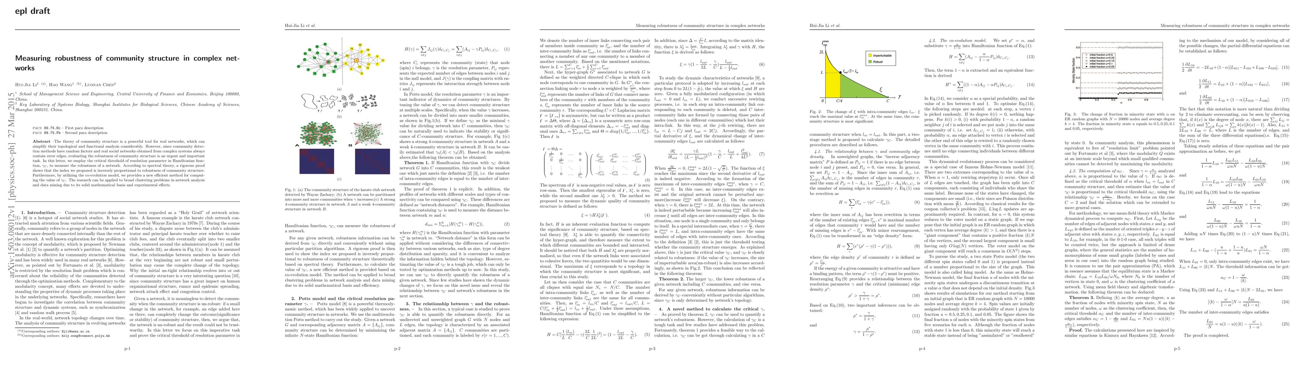 This paper proposes a method to measure the robustness of community structure in complex networks using the critical threshold of the resolution parameter in the Hamiltonian function, $\gamma_C$. It demonstrates that a lower $\gamma_C$ indicates higher robustness and introduces a co-evolution model for efficient computation. The approach has broad applications in network analysis and data mining.