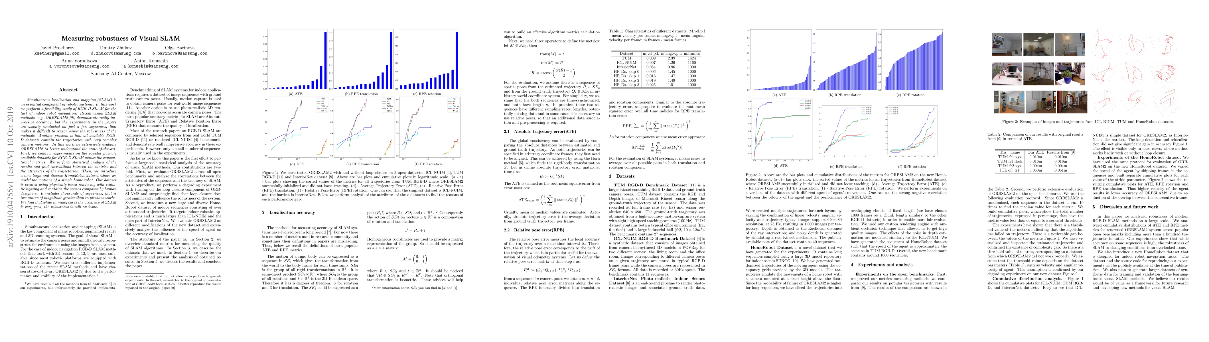 Simultaneous localization and mapping (SLAM) is an essential component of robotic systems. In this work we perform a feasibility study of RGB-D SLAM for the task of indoor robot navigation. Recent visual SLAM methods, e.g. ORBSLAM2 \cite{mur2017orb}, demonstrate really impressive accuracy, but the experiments in the papers are usually conducted on just a few sequences, that makes it difficult to reason about the robustness of the methods. Another problem is that all available RGB-D datasets contain the trajectories with very complex camera motions. In this work we extensively evaluate ORBSLAM2 to better understand the state-of-the-art. First, we conduct experiments on the popular publicly available datasets for RGB-D SLAM across the conventional metrics. We perform statistical analysis of the results and find correlations between the metrics and the attributes of the trajectories. Then, we introduce a new large and diverse HomeRobot dataset where we model the motions of a simple home robot. Our dataset is created using physically-based rendering with realistic lighting and contains the scenes composed by human designers. It includes thousands of sequences, that is two orders of magnitude greater than in previous works. We find that while in many cases the accuracy of SLAM is very good, the robustness is still an issue.