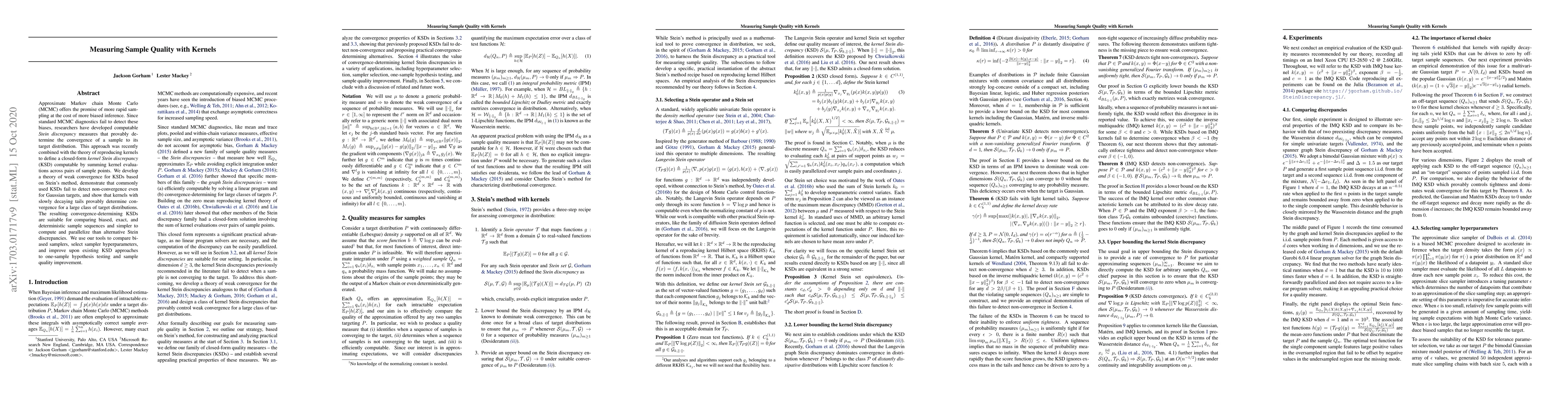 Approximate Markov chain Monte Carlo (MCMC) offers the promise of more rapid sampling at the cost of more biased inference. Since standard MCMC diagnostics fail to detect these biases, researchers have developed computable Stein discrepancy measures that provably determine the convergence of a sample to its target distribution. This approach was recently combined with the theory of reproducing kernels to define a closed-form kernel Stein discrepancy (KSD) computable by summing kernel evaluations across pairs of sample points. We develop a theory of weak convergence for KSDs based on Stein's method, demonstrate that commonly used KSDs fail to detect non-convergence even for Gaussian targets, and show that kernels with slowly decaying tails provably determine convergence for a large class of target distributions. The resulting convergence-determining KSDs are suitable for comparing biased, exact, and deterministic sample sequences and simpler to compute and parallelize than alternative Stein discrepancies. We use our tools to compare biased samplers, select sampler hyperparameters, and improve upon existing KSD approaches to one-sample hypothesis testing and sample quality improvement.