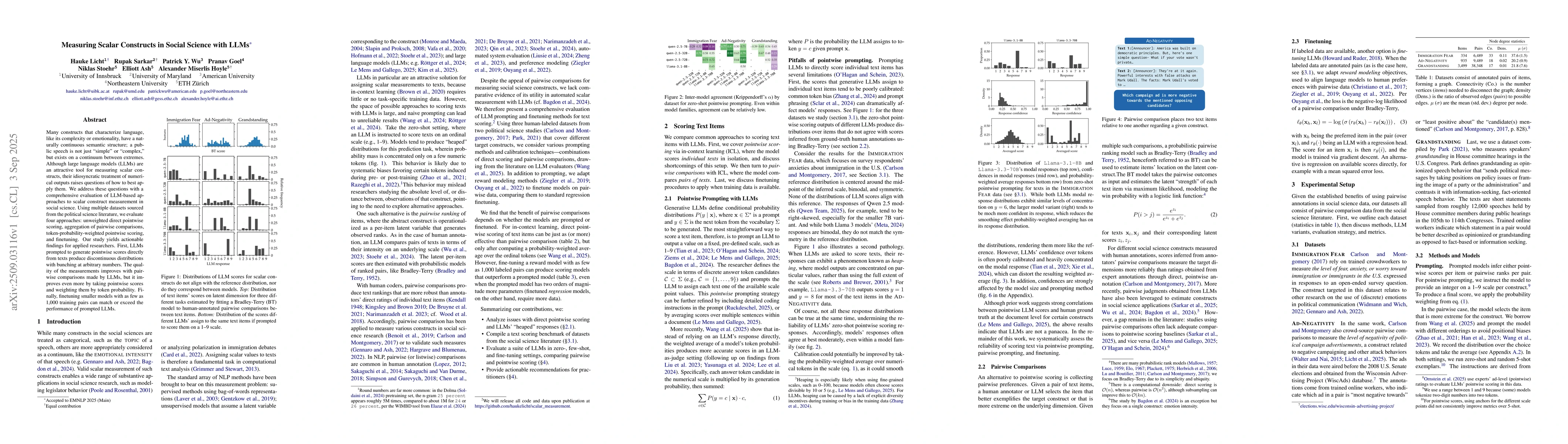 Many constructs that characterize language, like its complexity or emotionality, have a naturally continuous semantic structure; a public speech is not just "simple" or "complex," but exists on a continuum between extremes. Although large language models (LLMs) are an attractive tool for measuring scalar constructs, their idiosyncratic treatment of numerical outputs raises questions of how to best apply them. We address these questions with a comprehensive evaluation of LLM-based approaches to scalar construct measurement in social science. Using multiple datasets sourced from the political science literature, we evaluate four approaches: unweighted direct pointwise scoring, aggregation of pairwise comparisons, token-probability-weighted pointwise scoring, and finetuning. Our study yields actionable findings for applied researchers. First, LLMs prompted to generate pointwise scores directly from texts produce discontinuous distributions with bunching at arbitrary numbers. The quality of the measurements improves with pairwise comparisons made by LLMs, but it improves even more by taking pointwise scores and weighting them by token probability. Finally, finetuning smaller models with as few as 1,000 training pairs can match or exceed the performance of prompted LLMs.